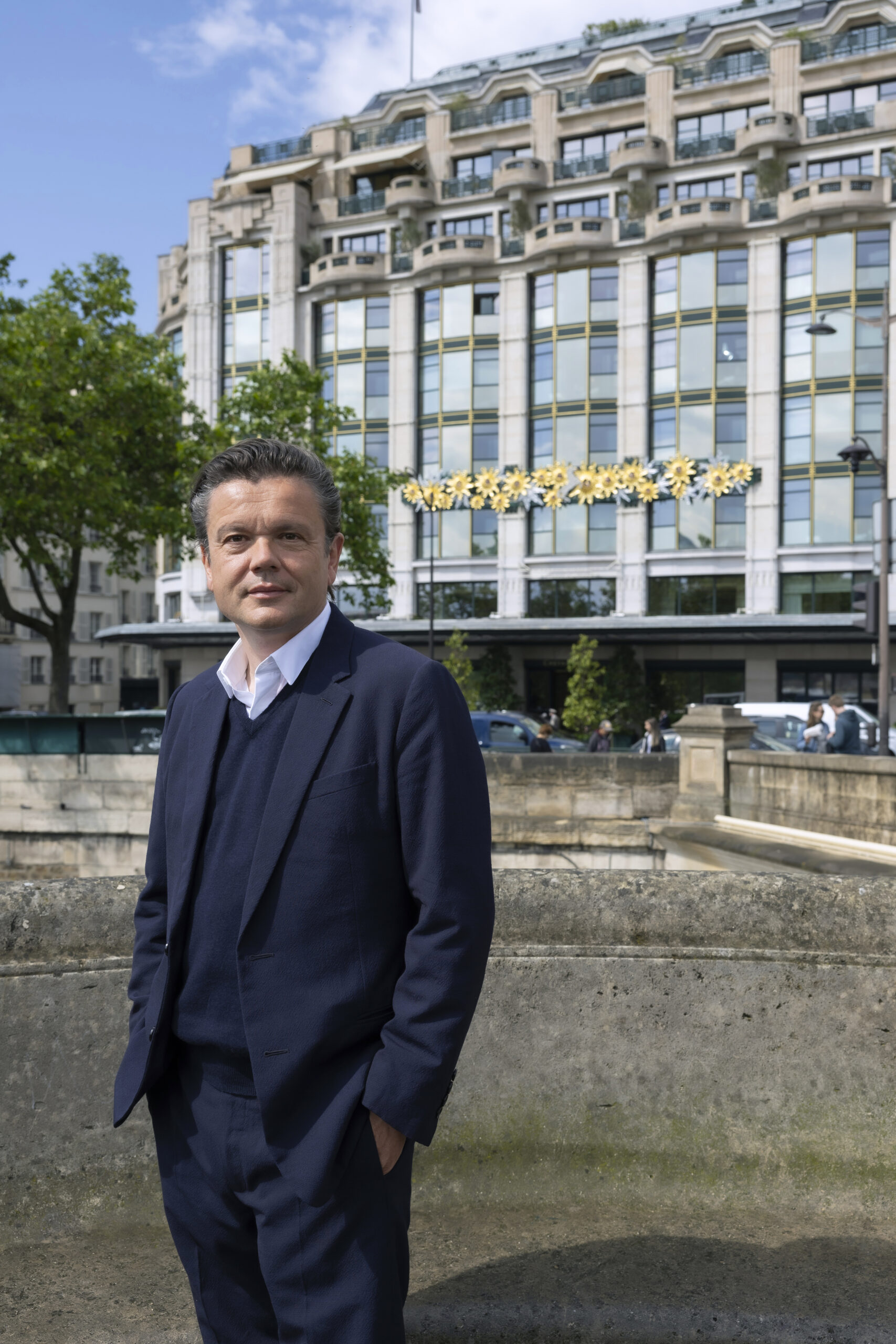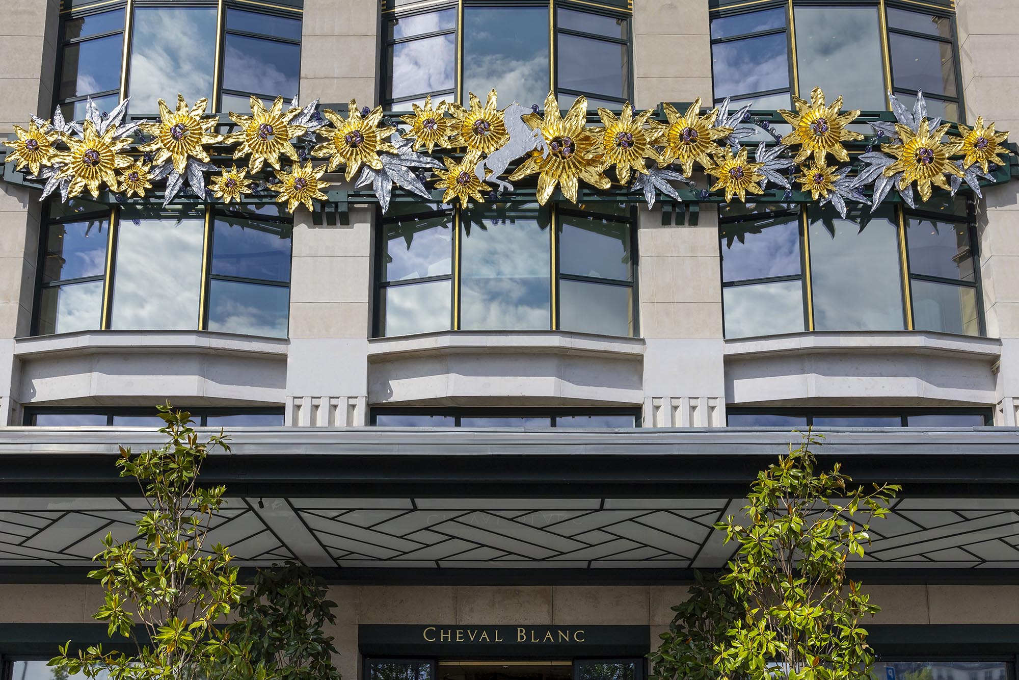 À quelques semaines de la cérémonie d’ouverture des Jeux Olympiques sur la Seine, l’hôtel situé le long du quai, a inauguré une nouvelle œuvre d’art sur sa façade, en face du célèbre Pont-Neuf. La frise de 17 mètres de long, nommée « Les Fleurs de la Passion », est un bas-relief en aluminium fondu doré à la feuille d’or, orné d’une guirlande de bulles en verre de Murano, inspirée à la fois de l’Art déco et de l’Art nouveau. L’artiste a souligné que cette œuvre est un hommage au style architectural de l’édifice, célèbre pour avoir été l’un des magasins historiques de la Samaritaine. Cette frise scintillante dès l’apparition du soleil est visible depuis le quai du Louvre.