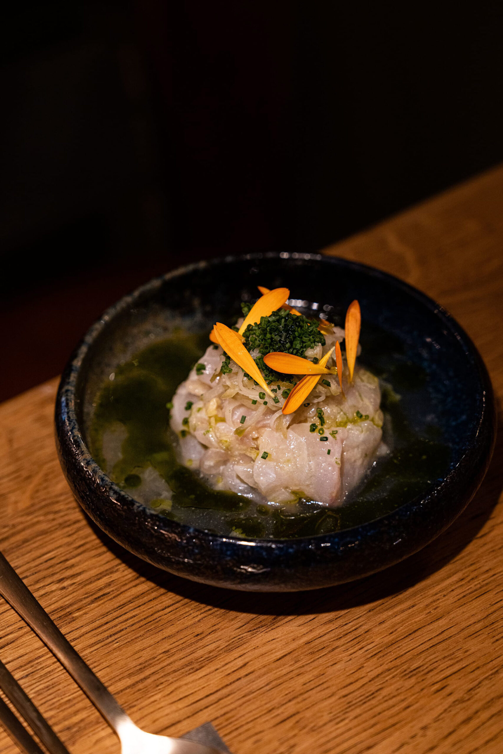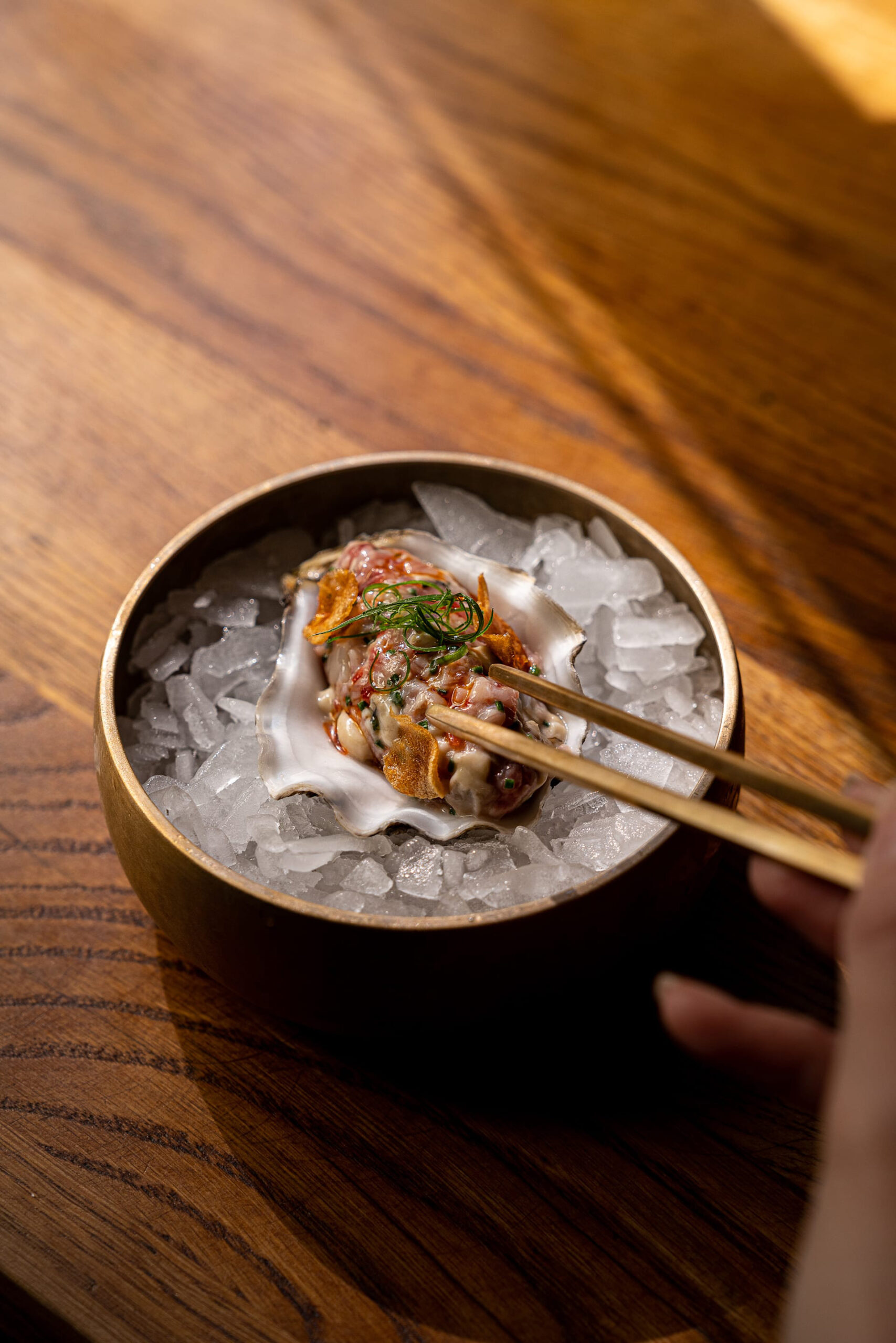 Avec Mojju, Thibault Sombardier, finaliste de Top Chef 2014 reconnu pour sa cuisine bistrotière moderne et créative, signe une table qui conjugue la convivia-lité du bistrot parisien et les saveurs asiatiques. Le décor, pensé comme un hanok contemporain, associe lignes épurées, bois clair et touches artisanales, créant une atmos-phère à la fois chic et dépaysante. La galette de cébette ouvre le bal avec son croustillant délicat et ses notes végétales légè-rement piquantes, inspirée du pajeon coréen mais réinter-prétée avec une touche française. Vient ensuite la langoustine crue, un plat qui illustre la philosophie du chef : magnifier le produit brut par un geste précis. Enfin, les nouilles au sarrasin, servies froides, déploient leur goût de noisette et leur texture ferme, rappelant les soba japonaises. Ici, elles s’accompagnent de homard et d’une vinaigrette au soja.