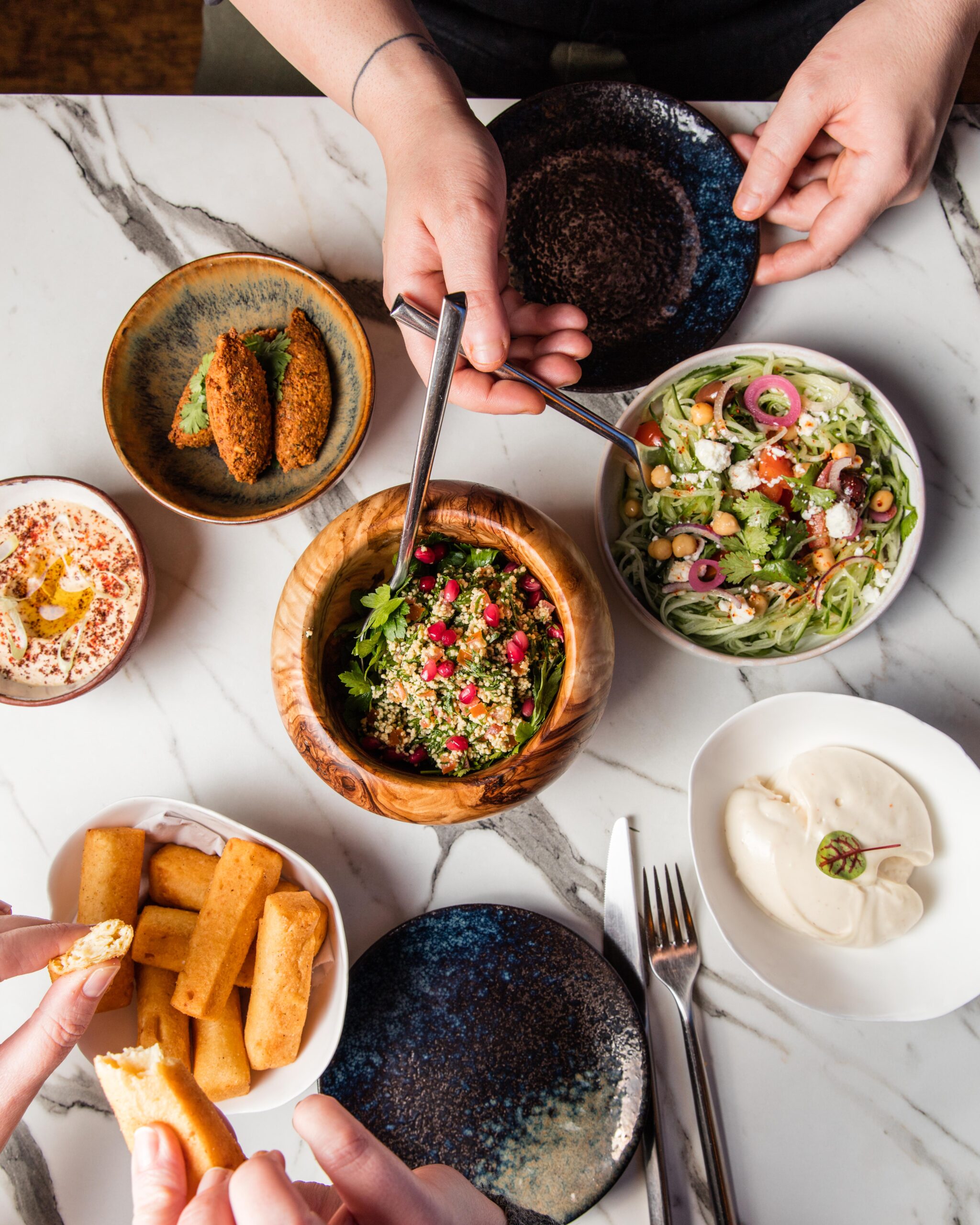 «Evi Evane» signifie «À votre santé» en grec ancien. C’est sur ce vieil adage que se lancent les sœurs Maria et Dina Nikolaou en 2005 dans leur première adresse parisienne au cœur de St Germain-des-Près. Aujourd’hui, la Maison compte 6 adresses dont une nouvelle rue de Bretagne. Ici, une cuisine grecque, saine et exclusivement faite maison est proposée. Les plats traditionnels de différentes régions de Grèce sont revisités et réinterprétés. Du ktipiti(crème de poivron à la feta),du houmous, du tzatziki en mezzes froids, du tyropita (feuilleté à la féta), des keftedes de pois chiches, de bœuf ou de courgettes en mezzes chauds. Pour les plats, de l’aubergine ou poivron farcis, des brochettes de viandes… Et en dessert le fameux portokalopita (gâteau à l’orange).
