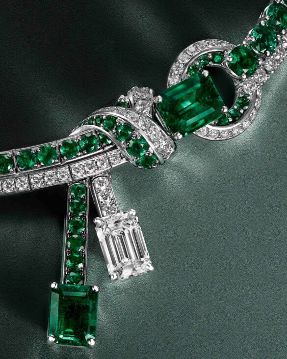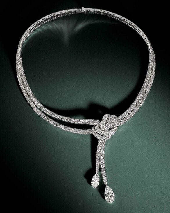 Graff est une Maison classique, mais jamais figée. Nous avons développé des lignes entrelacées extrêmement organiques, qui évoquent un nœud de soie noué dans un geste spontané. Créer un nœud qui semble se former naturellement est un défi magnifique, presque paradoxal. Il faut recréer la spontanéité, mais avec une structure invisible capable de soutenir des carats considérables. Les défis majeurs sont de maintenir la fluidité totale du nœud tout en assurant une ergonomie parfaite, sculpter des pierres sur mesure pour qu’elles épousent les courbes sans rupture visuelle, intégrer une ligne continue d’émeraudes taille brillant, ce qui nécessite une précision micrométrique pour préserver l’illusion d’un ruban lumineux, créer une structure interne légère mais d’une résistance impeccable.
