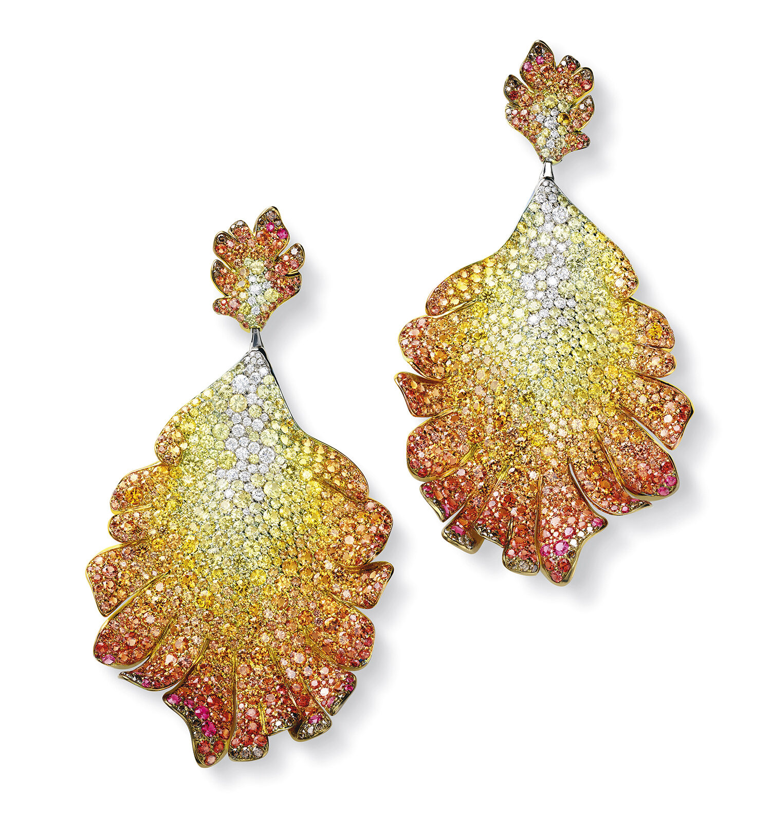 Boucles d’oreilles, or éthique blanc, titane, saphirs orange et jaune, diamants et spinelles, collection Red Carpet, Chopard