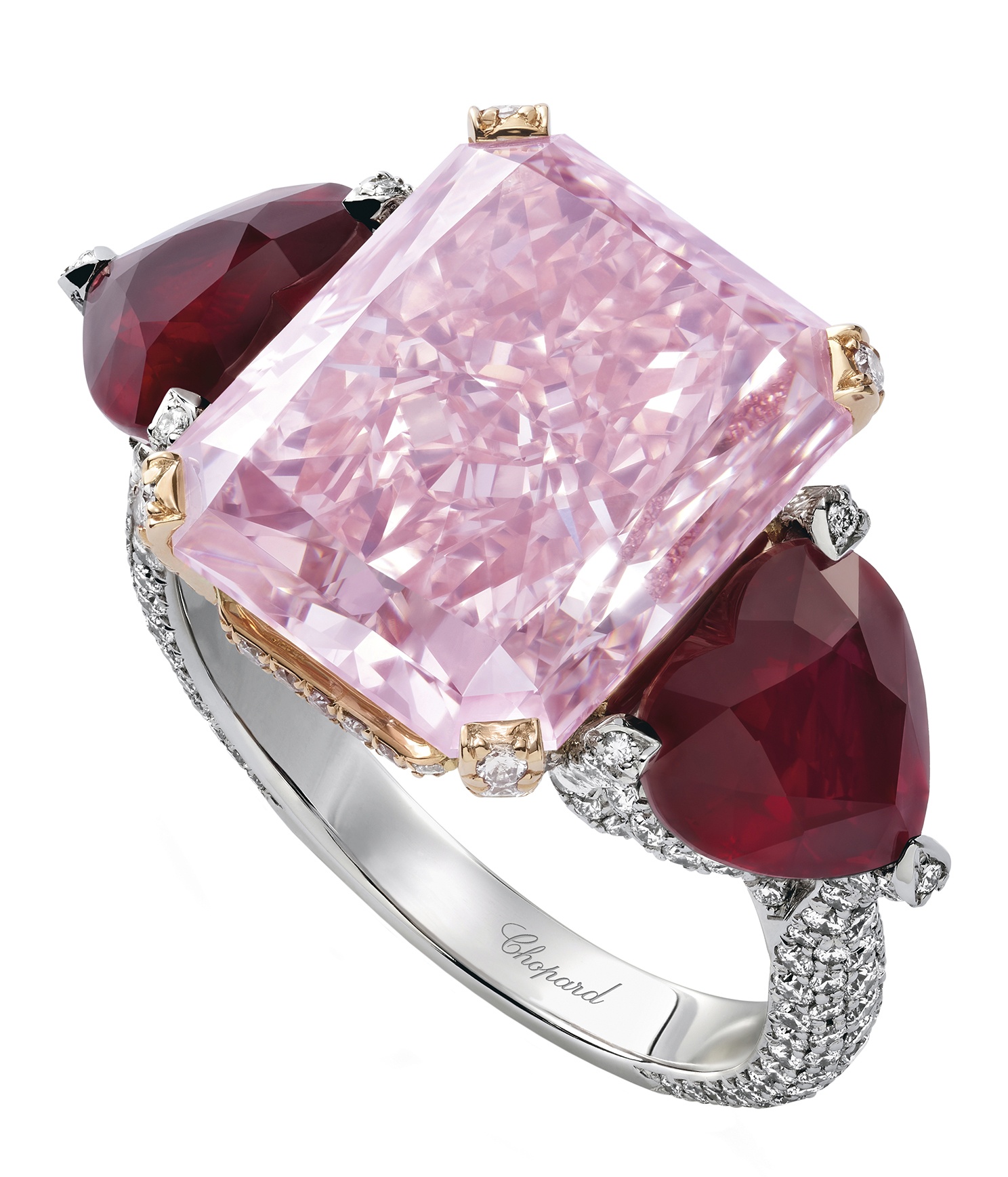 Bague, collection haute joaillerie, or éthique blanc et rose, serti du diamant « Rose de Caroline », rubis, diamants blancs et roses, Chopard
