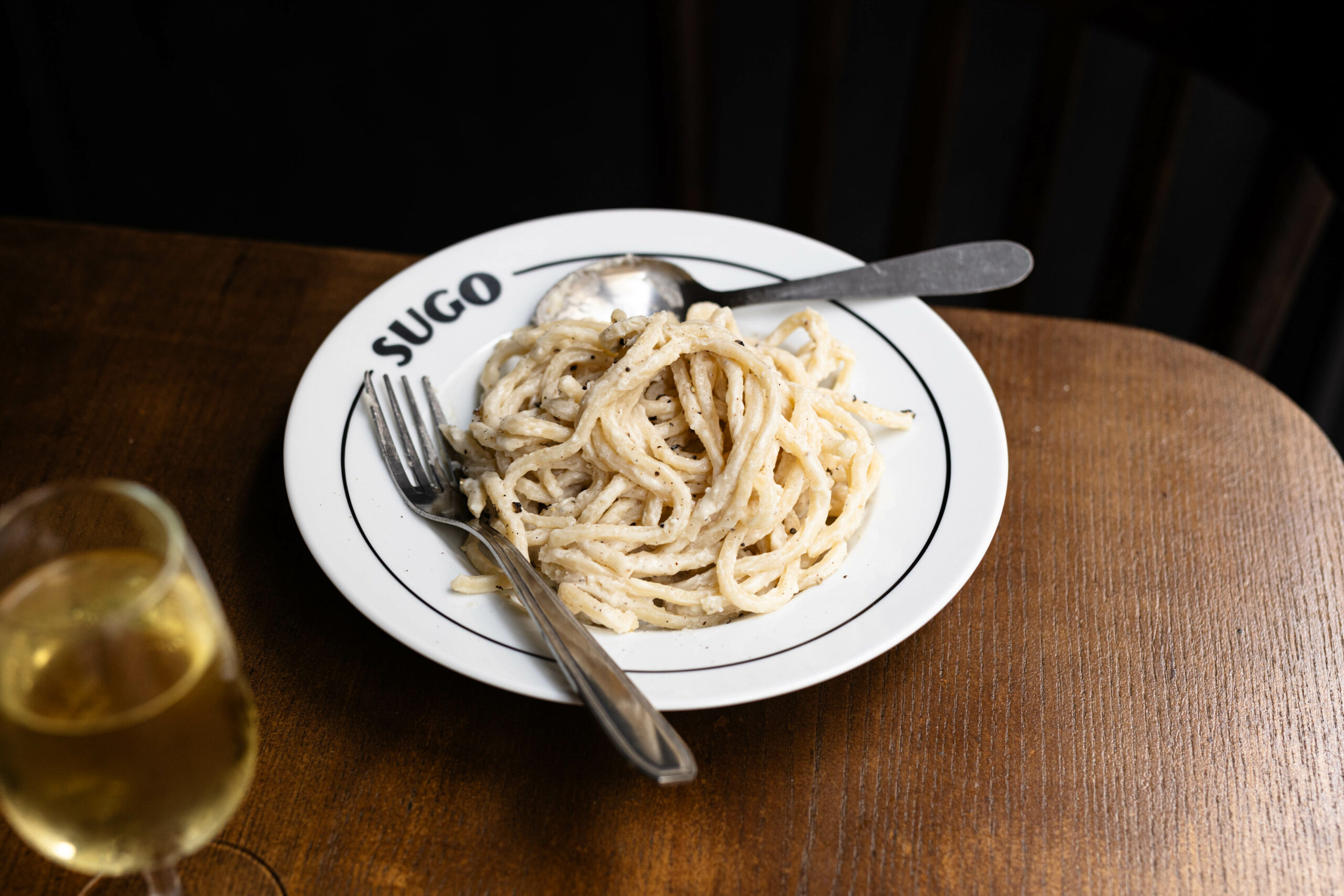 Sugo (sauce en italien) est un restaurant italien offrant des pâtes fraîches faites maison à des prix abordables. Le chef, Arthur Dumait, a choisi une cuisine simple et familiale inspirée de ses expériences en Italie. Le menu propose 5 recettes de pâtes permanentes, préparées avec des ingrédients de qualité. Tous les jours une recette est ajoutée au menu, ce midi-là il y avait de sublimes lasagnes à la carte. Nous avons aussi adoré les Cacio E Peppe, leur recette fétiche. 2 ingrédients : du fromage, ici du Pecorino Romano 18 mois et du poivre, qui est toasté. Les pâtes sont des tonnarelli. Une cuisson parfaite. Un régal !