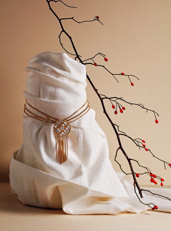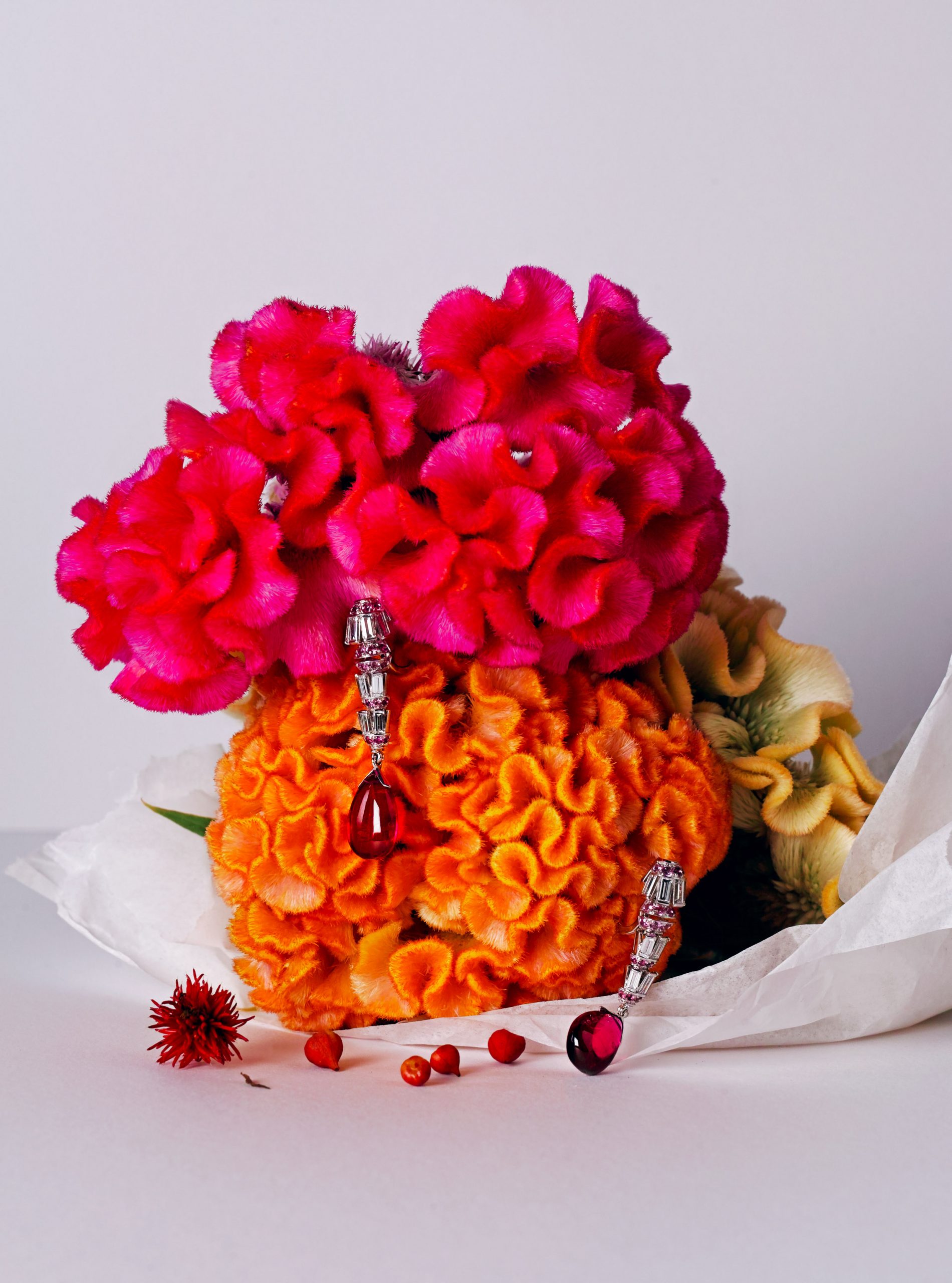 Notre dossier Irrésistibles Tentations rassemble les pièces les plus exceptionnelles parmi les collections de haute joaillerie automne-hiver 2020-2021 des plus grandes mai- sons, dont la plupart sont parisiennes. Sélectionnés pour leur extravagance, leur grâce, leur élégance, leurs couleurs éclatantes… chaque bague, bracelet ou collier possède sa magie. Nous avons demandé au duo créatif parisien AlmaKarina de réaliser des images où chaque bijou mis en scène raconterait une histoire. La nature morte est leur domaine de prédilection, car elle rejoint leur intérêt pour les détails, le dialogue entre les objets et l’harmonie des matières et des couleurs. Tandis que la styliste Karina assemble avec délicatesse une fleur avec une boucle d’oreille, une pierre délicatement peinte en or avec un collier, Tom compose la lumière et cadre les photos. «Dans cette série, nous avons travaillé sur la rencontre entre les matières, entre le précieux et le brut, le sophistiqué et la simplicité. Avec des références à la culture japonaise, tels le kenzan, l’ikebana, les branchages, la céramique… pour aboutir à un résultat à la fois élégant et très pur, à la limite du dépouillement.»