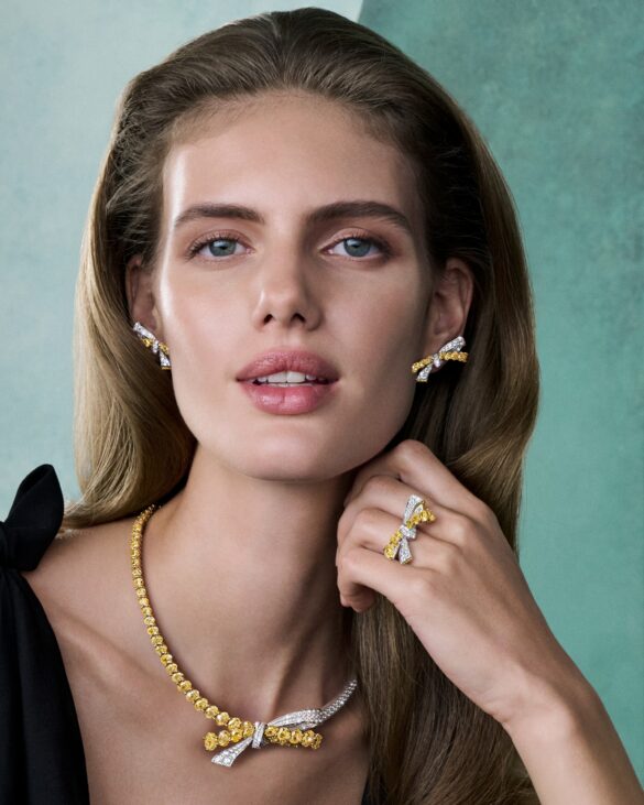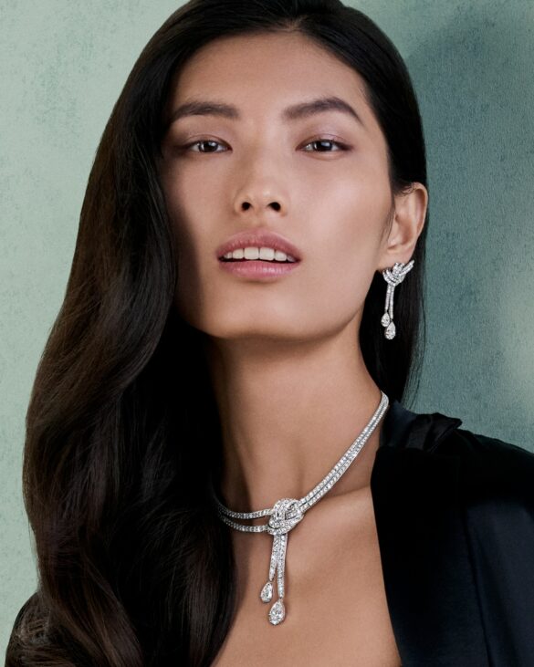 Façonnée par les artisans de la Maison, chaque création se distingue par des formes fluides et élégantes: un collier, des boucles d’oreilles et une bague en or blanc révèlent trois nœuds exubérants sublimés sur chaque face par des diamants, le nœud lacé se retrouve aussi sur un collier audacieux et spectaculaire, tandis que, plus délicats, de fins fils en or blanc dessinent des nœuds doubles. On découvre aussi un set de haute joaillerie aux teintes solaires, où les diamants blancs contrastent avec les diamants Fancy Intense Yellow et un collier où les deux rangées se réunissent en un nœud volumineux et asymétrique.