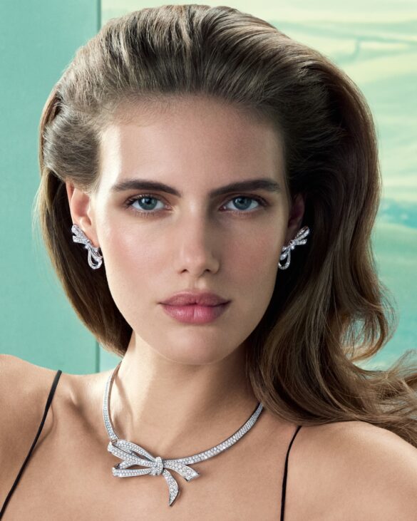 Colliers, boucles d’oreilles, bracelets et bagues dessinent des silhouettes délicatement nouées, où la grâce du geste rencontre l’éclat absolu des diamants Graff. Les rubans semblent flotter, capturant la lumière avec une subtile fluidité.