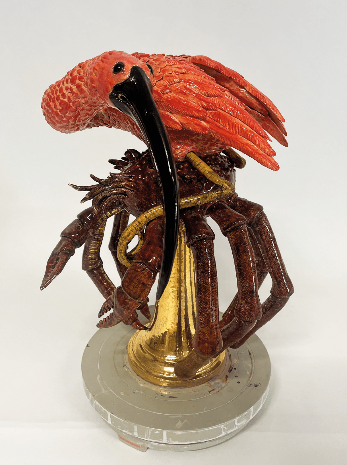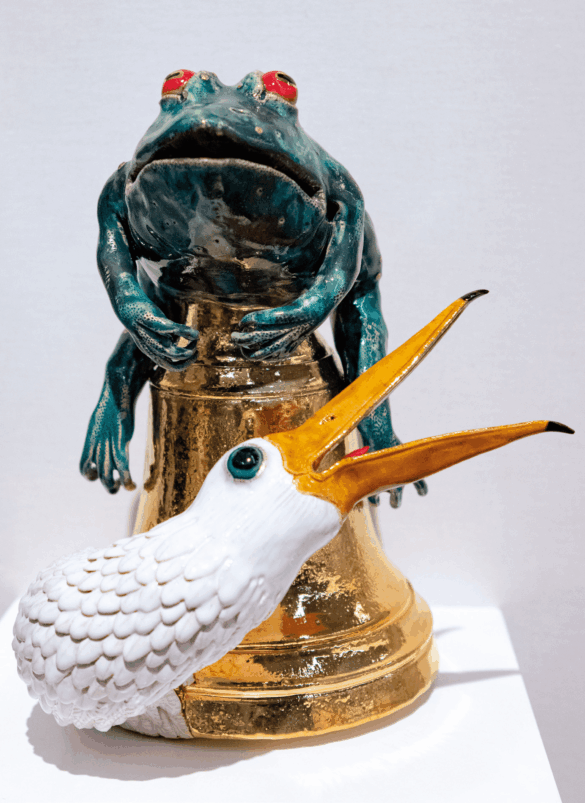 Les animaux se chevauchent, s’écrasent les uns les autres et parfois tentent de se dévorer. Les crocodiles surgissent d’un bouquet de fleurs, les grenouilles sortent du fond d’un bocal ou s’empilent, des poissons s’amassent en bloc, les langoustes prennent la pose, les oiseaux jouent avec leur bec coloré et leur long cou et s’enroulent autour des statues…