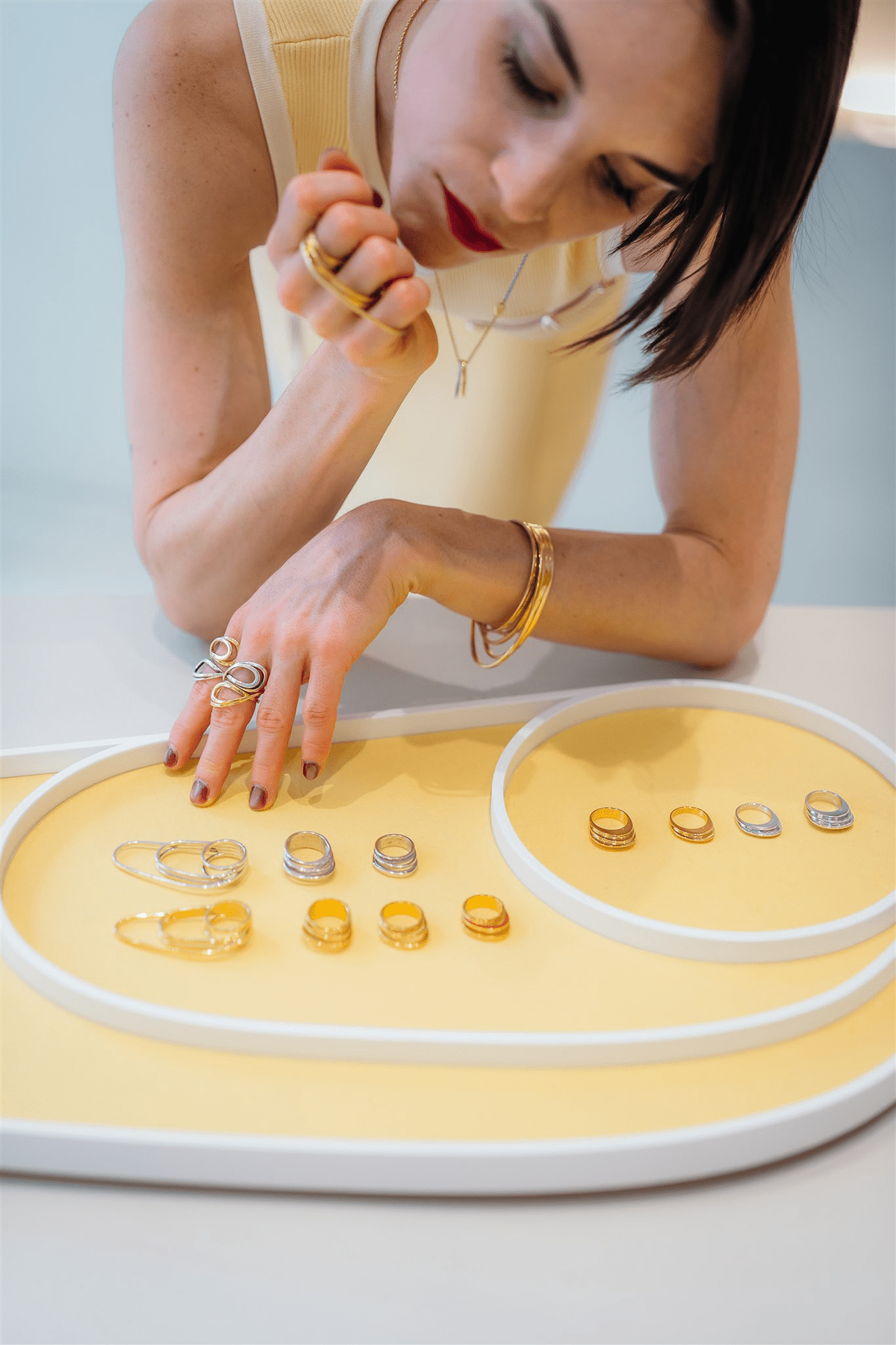 L’architecte de l’intime Ayça Özbank Taşkan a d’abord dessiné des bâtiments avant de dessiner des bijoux. Architecte de formation, passée par Istanbul, l’Europe et désormais Paris, elle a troqué le béton pour l’or, l’argent et le vermeil. En 2015, avec son mari, le designer Gökçe Taskan, elle fonde Mara Paris : une maison qui transpose les lignes modernistes et les volumes assumés de l’architecture sur le corps. Icône involontaire, le Pod Huff, pensé au départ pour maintenir des AirPods, est devenu pièce culte : à la fois pratique, sculptural et décalé. Dix ans plus tard, la maison souffle ses bougies avec Natura Forma, première incursion en haute joaillerie. Or et diamants s’y frottent à des formes organiques, comme si la matière reprenait ses droits.