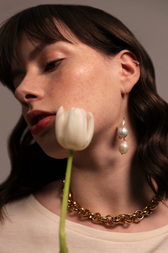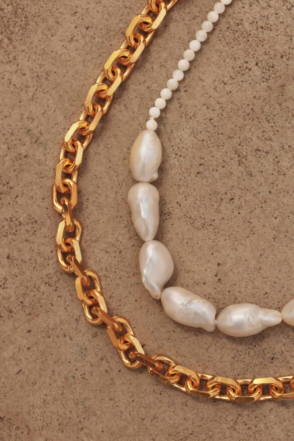Les perles indociles Passée par Christian Lacroix, Jean Paul Gaultier et dix ans chez Lacoste aux côtés de Christophe Lemaire, Virginie Voncken a longtemps façonné les silhouettes de la mode avant de signer ses propres bijoux. En 2021, elle fonde sa maison et, trois ans plus tard, lance une première collection bâtie autour d’un matériau iconique : la perle. Mais pas la perle sage. Ici, elle est baroque, irrégulière, imprévisible. Mariée au laiton doré, elle devient le cœur d’un vocabulaire sensible qui revendique l’imperfection. Le collier Maillon, chaîne dorée interrompue par un mousqueton massif, condense cette écriture : un bijou pensé pour dialoguer avec le vêtement. Virginie Voncken compose une joaillerie intime, faite de paysages intérieurs et de fragments sensibles. Luxe brut, instinctif, vibrant.