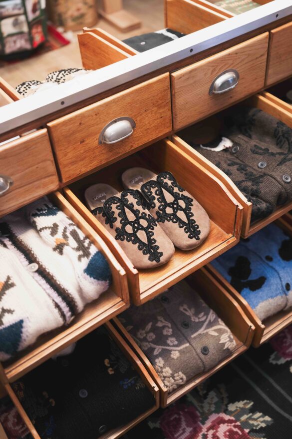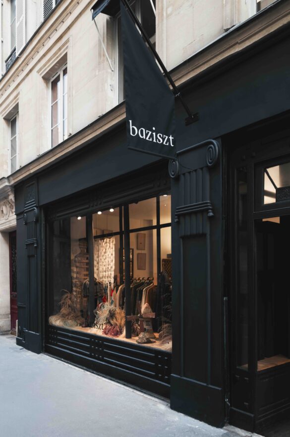 On l’attendait depuis des années : la première boutique Baziszt a enfin ouvert rue Saint-Roch. Elle dévoile un lieu qui semble réservé aux initiés, un écrin de plus de 80 m² répartis sur deux niveaux où chaque détail porte une histoire. La décoration, soigneusement chinée, compose un cabinet de curiosités contemporain : meuble ancien à chemises dédié à la maille, planches d’herbiers, mannequin en rotin, paravent vintage, panneaux japonais laqués. Des animaux naturalisés surveillent les visiteurs et un tourniquet de cartes postales anciennes invite à la rêverie. La cabine d’essayage, pensée comme un boudoir, crée un moment suspendu, délicieusement intime. À l’étage, un salon privé accueille les clientes dans une atmosphère de maison, propice à l’essayage et au temps pour soi.