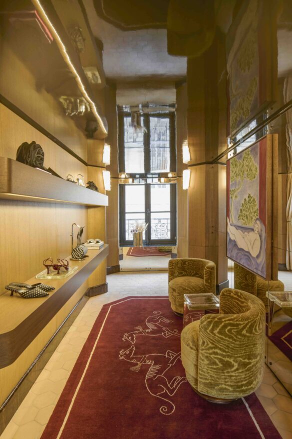 Très attendue, la première adresse européenne de Reformation a pris ses quartiers rue des Francs-Bourgeois. Sur deux étages, la maison californienne déroule son vestiaire inspiré du vintage : robes, denim, pièces d’extérieur, sacs, bijoux, le tout orchestré dans une esthétique rétro imaginée avec le studio parisien Le Cann. Au centre, un monumental escalier en fer forgé, conçu sur-mesure et fabriqué en Italie, structure l’espace. Les carreaux de terre cuite réchauffent le sol, tandis que boiseries et tapis noués à la main par Les Éditions de tapis insufflent une douceur feutrée. Miroirs et suspensions en verre de Murano rappellent une certaine idée du glamour hollywoodien. Les murs, eux, accueillent une sélection d’artistes parisiennes – Galatée Martin, Milène Sanchez, Morgane Pasqualini, Renske Linders – réunies par Chapelle Projects, écho direct à l’ADN féministe et affirmé de la marque. À l’étage, l’atmosphère se fait plus intime : un canapé, des miroirs patinés, un esprit années 50. Dans les cabines, la technologie Retail X permet d’accéder au catalogue complet et de faire venir les pièces directement sur place : un mariage fluide entre digital et plaisir d’essayer.