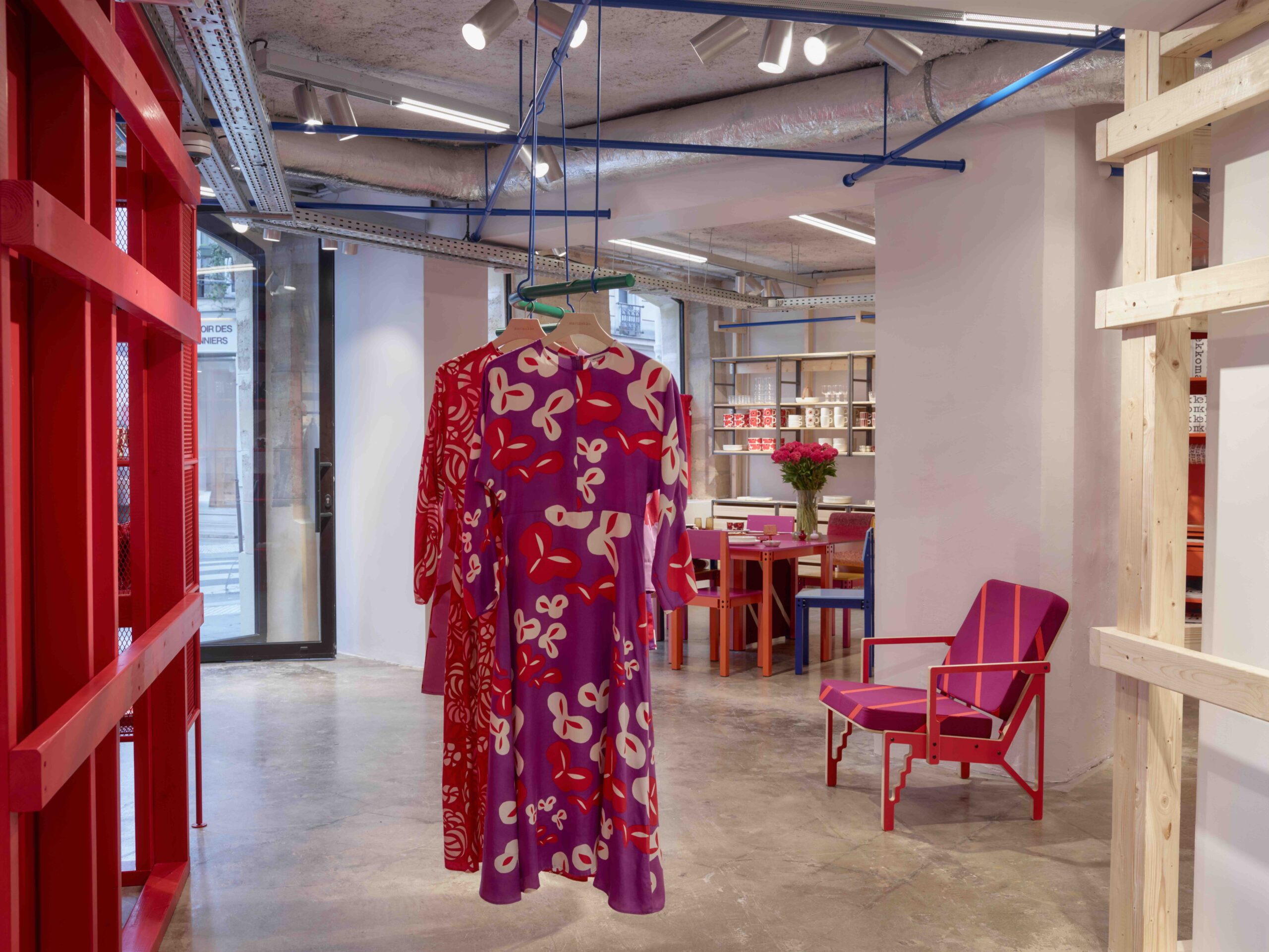 Après ses escales dans les grands magasins parisiens, Marimekko trouve enfin son adresse parisienne. Et c’est rue Vieille-du-Temple, au cœur d’un Marais vibrant, que la maison déploie son univers : un design franc, graphique, joyeux, fidèle à l’énergie d’Helsinki. Les 140 m² du flagship déploient les motifs iconiques. Les murs et le sol en béton, volontairement bruts, rappellent l’architecture de l’usine d’impression d’origine, des tamis, chariots à tissus et structures métalliques ponctuent l’espace, évoquant presque le son des machines. Les sacs deviennent une installation presque muséale, l’espace dédié à la table propose conseils, idées et combinaisons pour composer un intérieur nordique, lumineux, vivant.