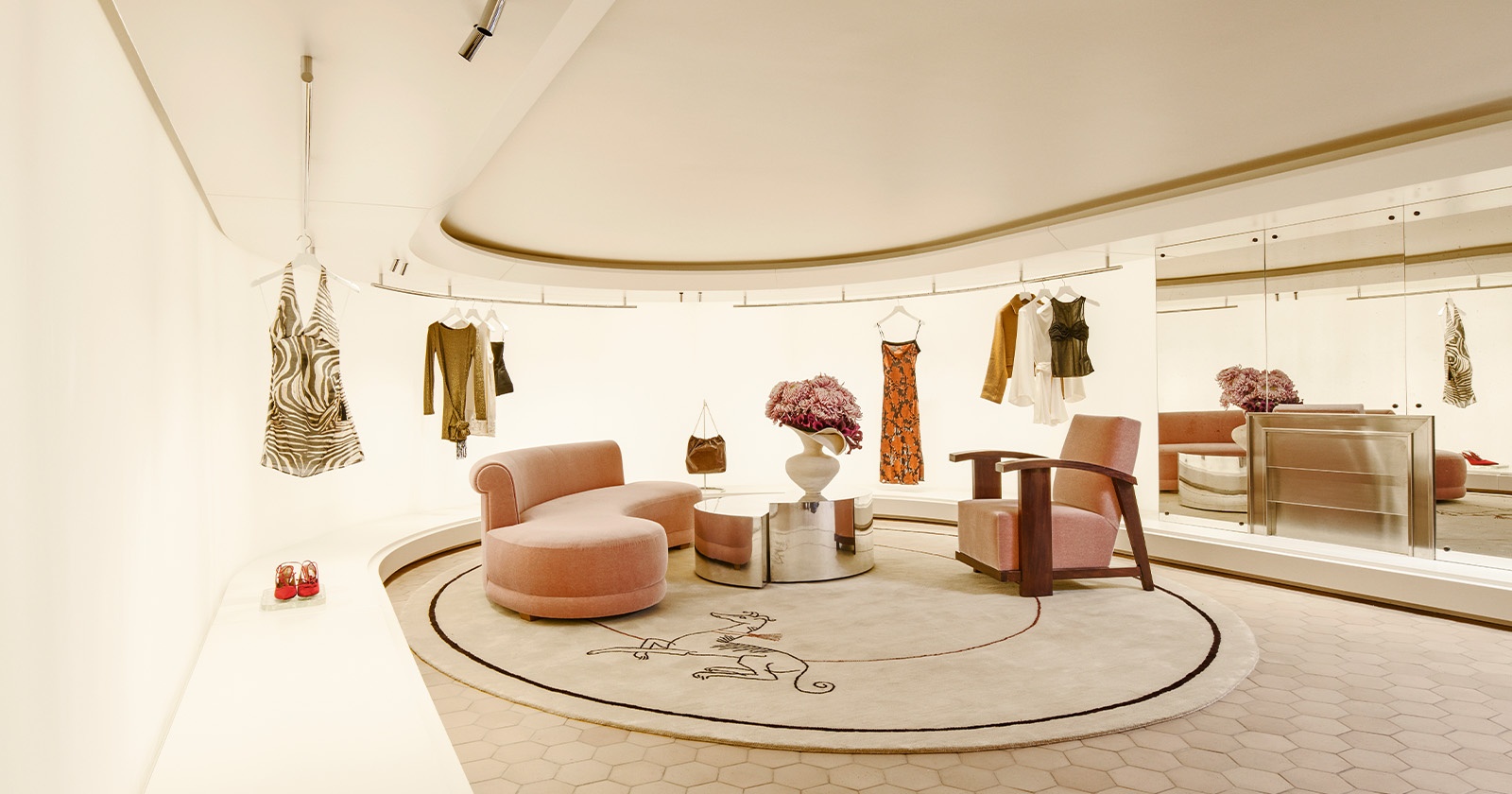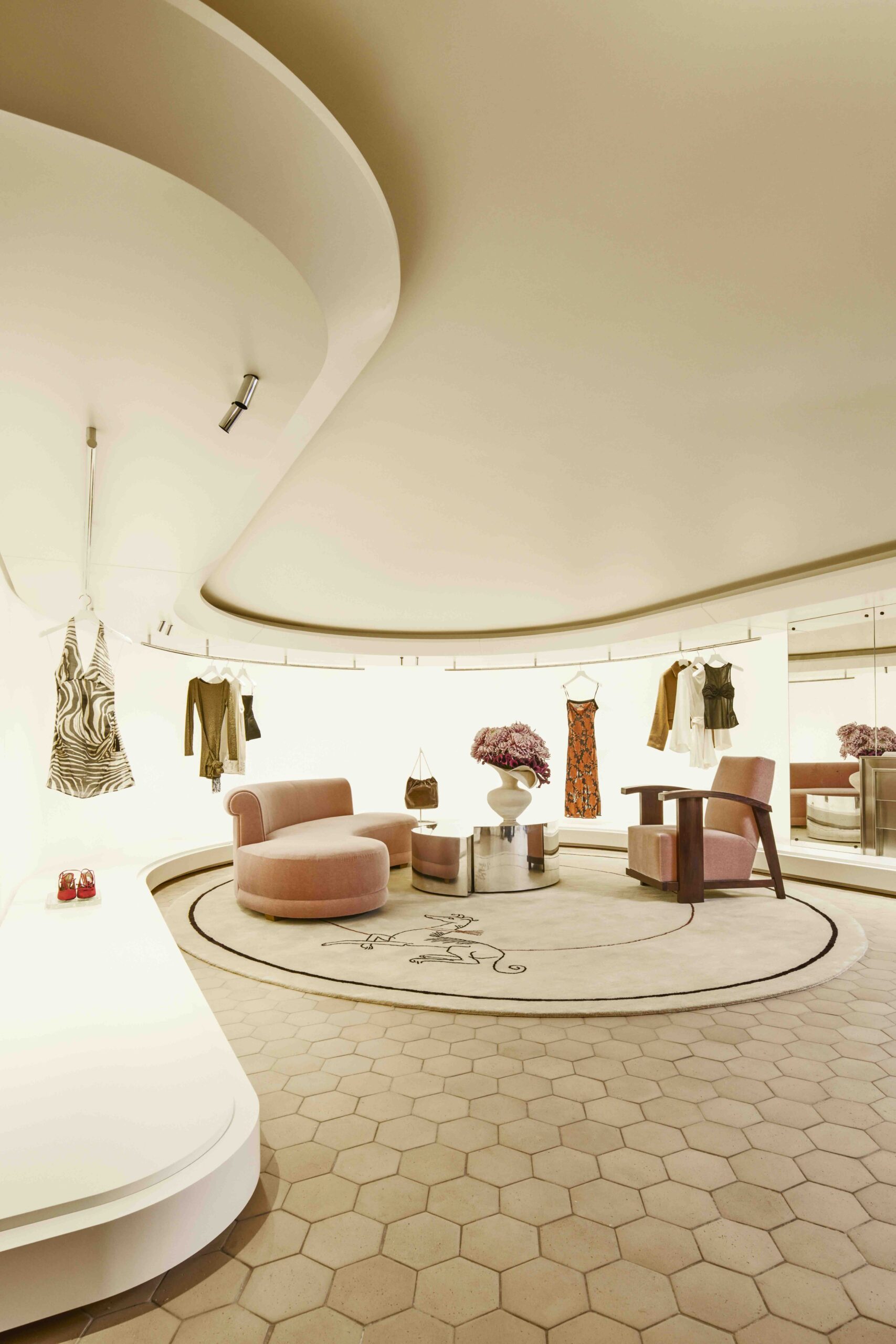 Très attendue, la première adresse européenne de Reformation a pris ses quartiers rue des Francs-Bourgeois. Sur deux étages, la maison californienne déroule son vestiaire inspiré du vintage : robes, denim, pièces d’extérieur, sacs, bijoux, le tout orchestré dans une esthétique rétro imaginée avec le studio parisien Le Cann. Au centre, un monumental escalier en fer forgé, conçu sur-mesure et fabriqué en Italie, structure l’espace. Les carreaux de terre cuite réchauffent le sol, tandis que boiseries et tapis noués à la main par Les Éditions de tapis insufflent une douceur feutrée. Miroirs et suspensions en verre de Murano rappellent une certaine idée du glamour hollywoodien. Les murs, eux, accueillent une sélection d’artistes parisiennes – Galatée Martin, Milène Sanchez, Morgane Pasqualini, Renske Linders – réunies par Chapelle Projects, écho direct à l’ADN féministe et affirmé de la marque. À l’étage, l’atmosphère se fait plus intime : un canapé, des miroirs patinés, un esprit années 50. Dans les cabines, la technologie Retail X permet d’accéder au catalogue complet et de faire venir les pièces directement sur place : un mariage fluide entre digital et plaisir d’essayer.