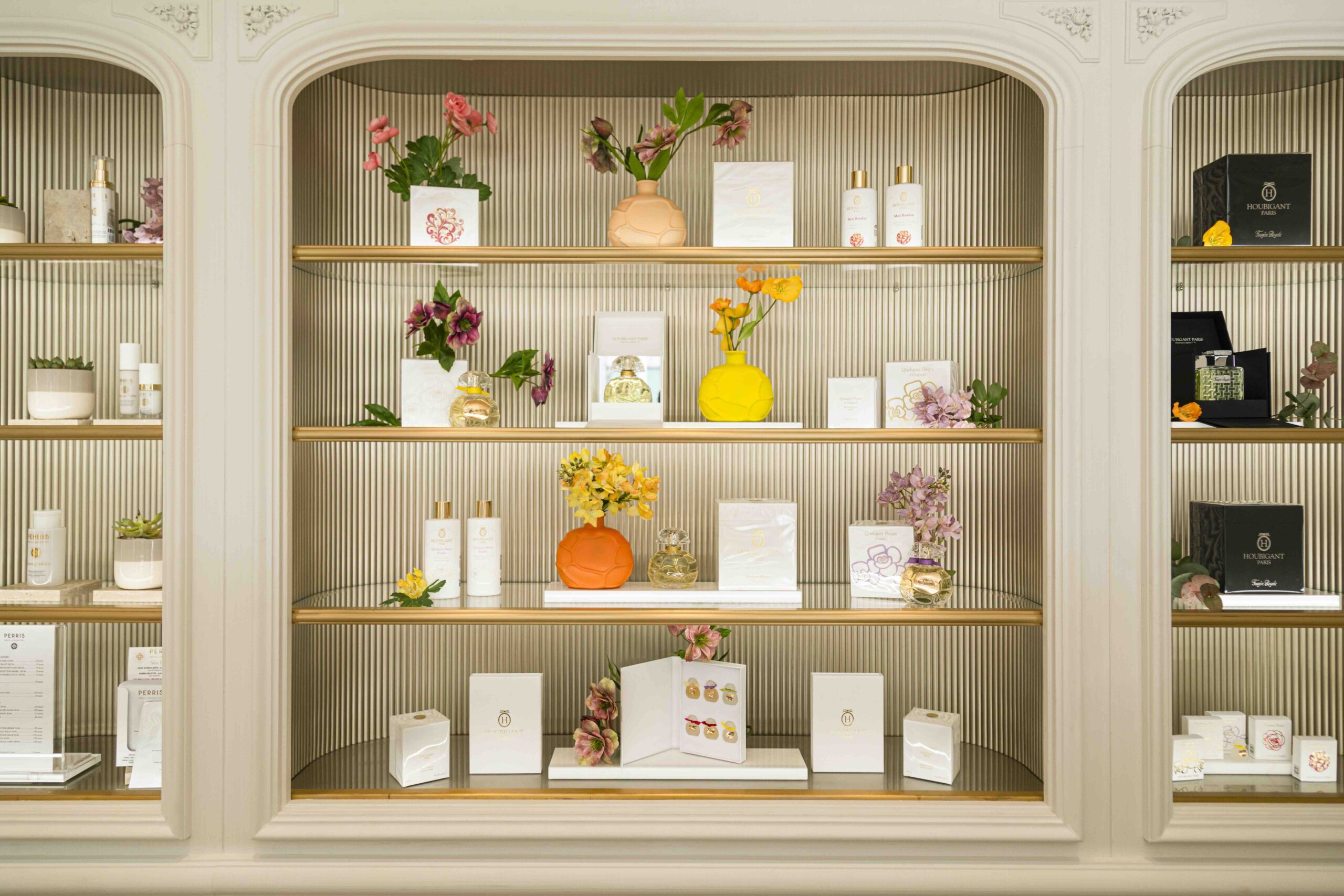 Maison fondée en 1775, Houbigant appartient à ces institutions dont l’histoire précède chaque visite. Au 62 rue Francois 1er, la façade distille déjà ce parfum d’éternité qui nimbe les grands dynasties olfactives. On imagine le pas de Marie-Antoinette, de Napoléon ou de Lady Diana résonner sous les moulures. À l’intérieur, Filippo Burresi compose un décor inspiré des palais : murs cannelés courbés, teintes champagne, finitions blanches brossées à la main, et une Boiserie Houbigant réinterprétée qui signe un classicisme contemporain. Les flacons, posés sur des étagères de verre cerclées de laiton, s’offrent comme des pièces de collection. Sur 80 m², la maison orchestre une immersion totale : collection complète, lignes Perris Monte Carlo et Perris Portogini, sélection skincare. Ici, on ne vient pas simplement sentir un parfum : on franchit le seuil d’un monde.