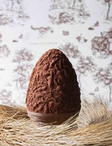 Cette année le chef pâtissier de l’hôtel Lutetia, Nicolas Guercio, nous propose deux magnifiques créations, aussi originales l’une que l’autre. Un œuf «Collection» à la forme d’une ancienne voiture de course et un œuf représentant le pilote de la voiture.