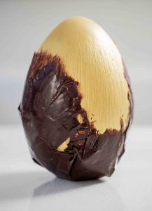Cet œuf est une véritable «Explosion de Gourmandises», chocolat au lait et praliné avec une petite touche de peps apportée par un sillon de Gianduja aux amandes et noisettes croquantes par Philippe Conticini.