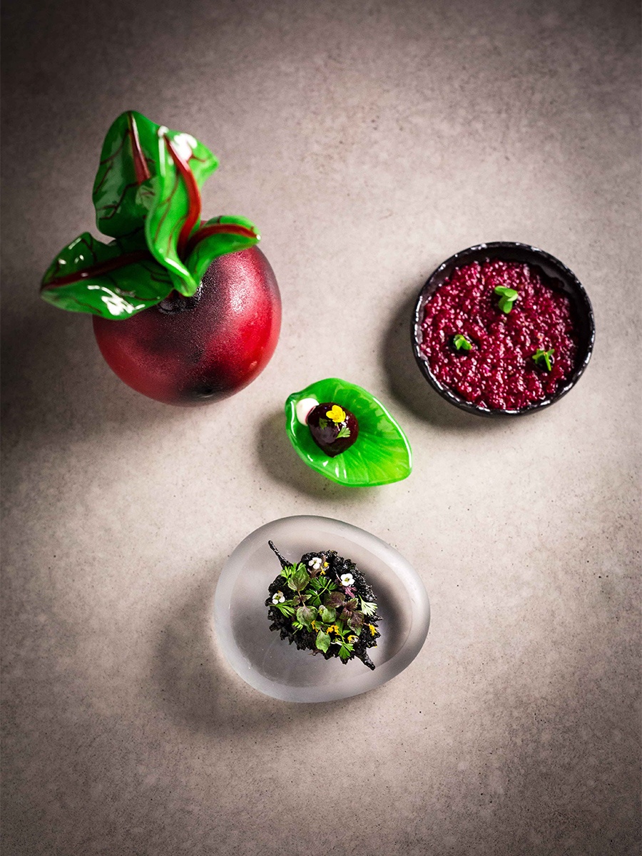 «J’ai choisi cette recette dont les ingrédients rappellent mon voyage au Mexique : la Californie faisait autrefois partie du Mexique, et, grâce à mes voyages au Yucatán, je m’en suis inspirée pour mêler l’histoire de ce pays. Lors de mon dernier voyage, j’ai collaboré avec le chef Roberto Solís, du restaurant Nectar, et je me suis inspirée de certaines des saveurs que j’ai goûtées, en particulier le recado negro. Les betteraves sont servies en deux services : l’une est assaisonnée comme un ceviche au leche de tigre, et la seconde est une traduction de ma part, qui suis d’origine française, avec une sauce bordelaise.»