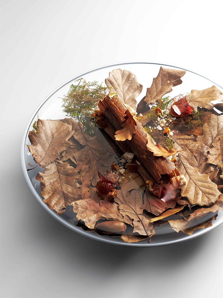 «Je suis né et j’ai grandi au Japon, dans une région où la nature est reine. Le Marron d’Aubenas est un dessert inspiré de mon enfance et plus particulièrement des promenades familiales dans la forêt. Ma saison préférée a toujours été l’automne, en raison des cueillettes de marrons et de châtaignes. Le visuel de ce dessert s’apparente à un morceau de branche tombé pendant l’automne, à l’image et aux couleurs d’une balade en forêt à cette époque de l’année. Gustativement, ce dessert est un doux mélange d’acidité. En plus des mandarines, nous retrouvons aussi ce côté automnal avec les châtaignes et les noix. Une crème glacée au rhum rehausse les saveurs. Ce dessert, malgré son côté gourmand, se distingue par sa légèreté. C’est ma création iconique servie au restaurant Epicure.»
