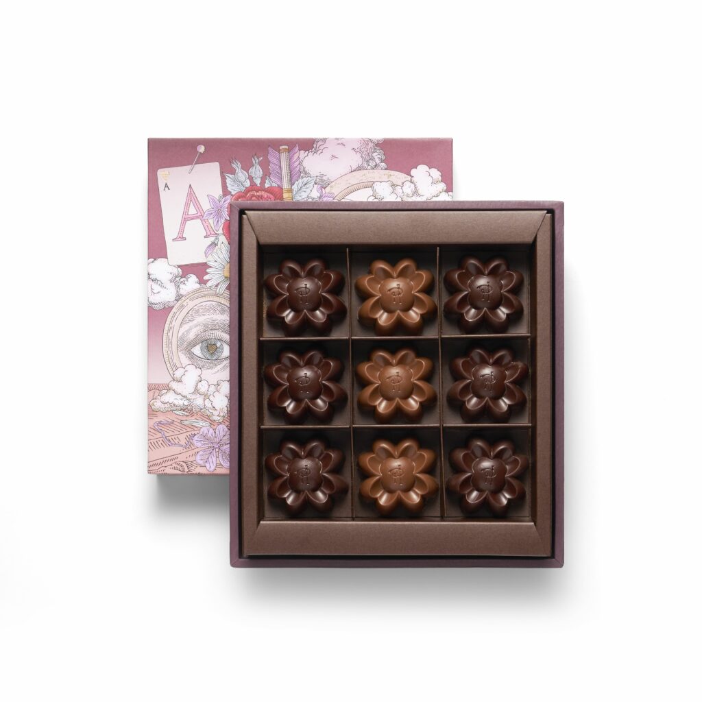 Cette précieuse tablette cache sous sa coque fleurie en chocolat noir un praliné chocolaté au sarrasin et au riz soufflé.