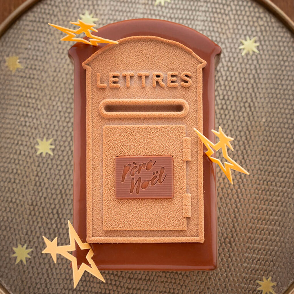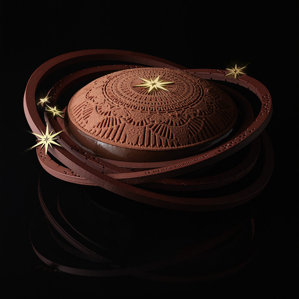 Inspirée de la coupole de l’Opéra Garnier, la bûche est composée à l’extérieur d’une mousse chocolat Vanuatu subtilement épicée, à l’intérieur d’un biscuit dacquoise au miel d’acacias et à la vanille de Madagascar, crème de nougat aux éclats d’amandes, aux pistaches torréfiées et au riz soufflé, crémeux chocolat noir Vanuatu pure origine 66%, confit de mandarine de Sicile, crémeux nougat au chocolat blanc, mousse au chocolat noir Vanuatu pure origine 77%.