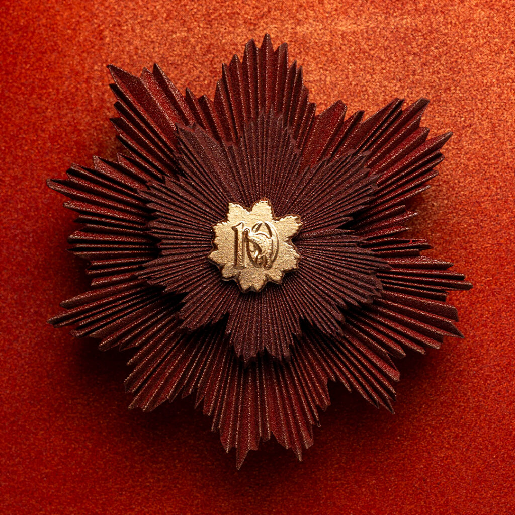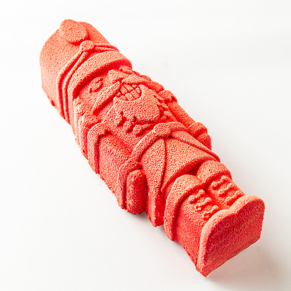 La bûche s’inspire de la robe haute couture Francis Poulenc imaginée par Christian Dior en 1950. Côté saveurs, un crémeux au chocolat noir grand cru pour la profondeur, un croustillant noisette pour la texture, une confiture de mandarine pour le twist fruité, puis une mousse saveur pain d’épices et un biscuit cacao pour la touche chaleureuse.