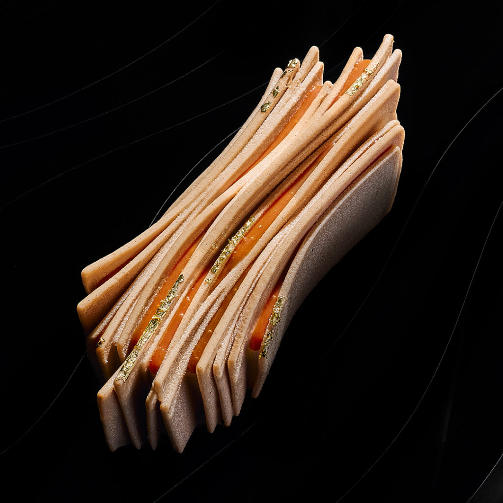 Inspirée du Yakisugi, technique japonaise de bois brûlé, cette bûche est composée : de chocolat subtilement fumé, d’une ganache mousseuse au beurre noisette qui enveloppe ses deux biscuits, de sobacha et de confiture de lait au café.