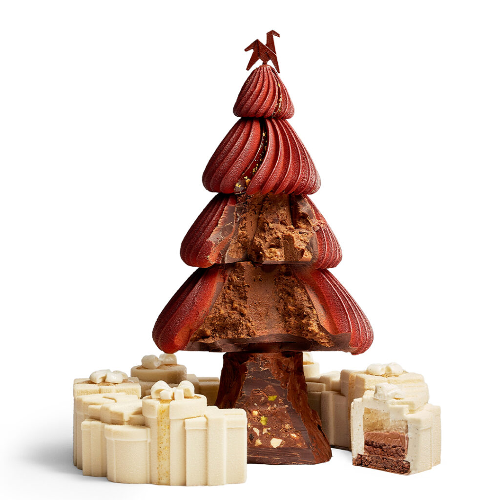 Cette bûche à plusieurs étages représente au centre un majestueux pins entouré d’un entremet de cadeaux. Le conifère est composé de garnitures au praliné et sablé spéculos, de mendiants garnis de pistaches, noisettes, amandes et oranges confites, d’aiguilles dorées en chocolat texturé rappelant l’intensité du cacao brut non conché et d’un cheval en chocolat au sommet de l’arbre. L’entremet de cadeaux, lui, est composé d’une base croustillante chocolat-amande, d’un biscuit parfumé aux épices et à la fève de tonka, d’un crémeux au chocolat au lait, de poires pochées nappées d’un gel poire-vanille rehaussé de liqueur de sapin et d’une mousse aérienne au fromage blanc et au miel de conifère.