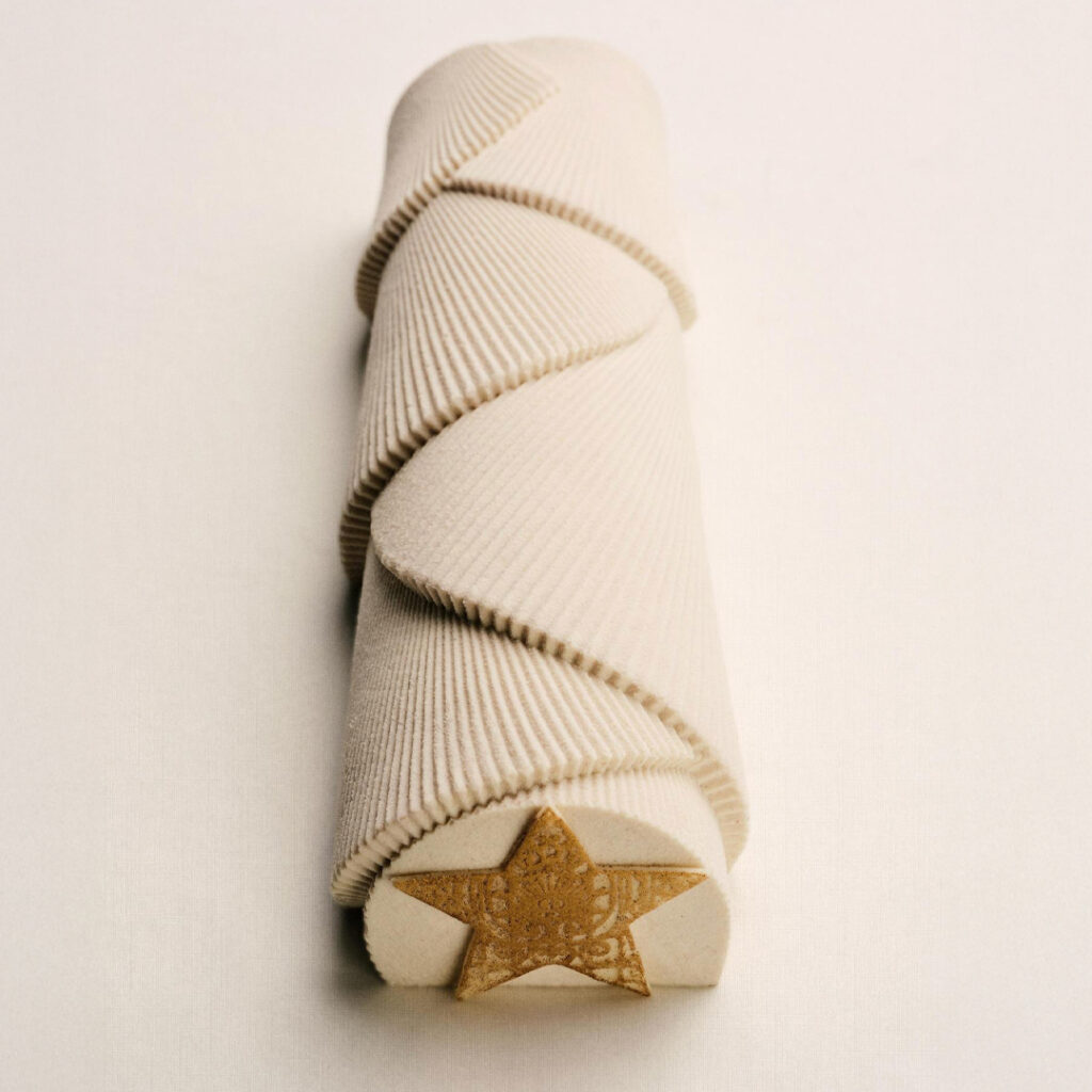 Semblable à une étoile polaire, la bûche se compose d’un croustillant fleur de Sel, d’un biscuit moelleux et d’un caramel infusé aux épices douces (vanille, poivre de Timut et fève tonka), avec un insert Riz au Lait et une mousse aux trois Vanilles (Madagascar, Tahiti et Mexique).