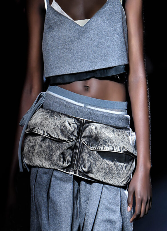 Parfois amovibles, elles s’invitent sur tous les looks, de la micro-robe au pantalon cargo. Chez Victoria/Tomas, un pantalon cargo baggy, réversible comme toutes les pièces de la maison, avec quatre poches XXL à revers. Il est porté taille basse avec un body Chantelle en dentelle. Chez Louis Vuitton, un jeu de volumes avec des détails exagérément agrandis. Longues ou ultra-courtes, les jupes Miu Miu se parent de poches XXL. Ici, une jupe en denim portée en superposition sur une jupe en velours.