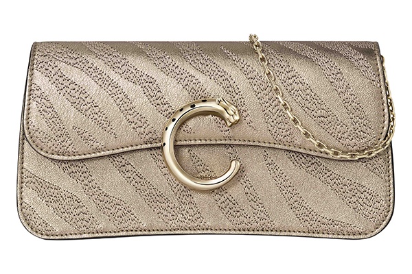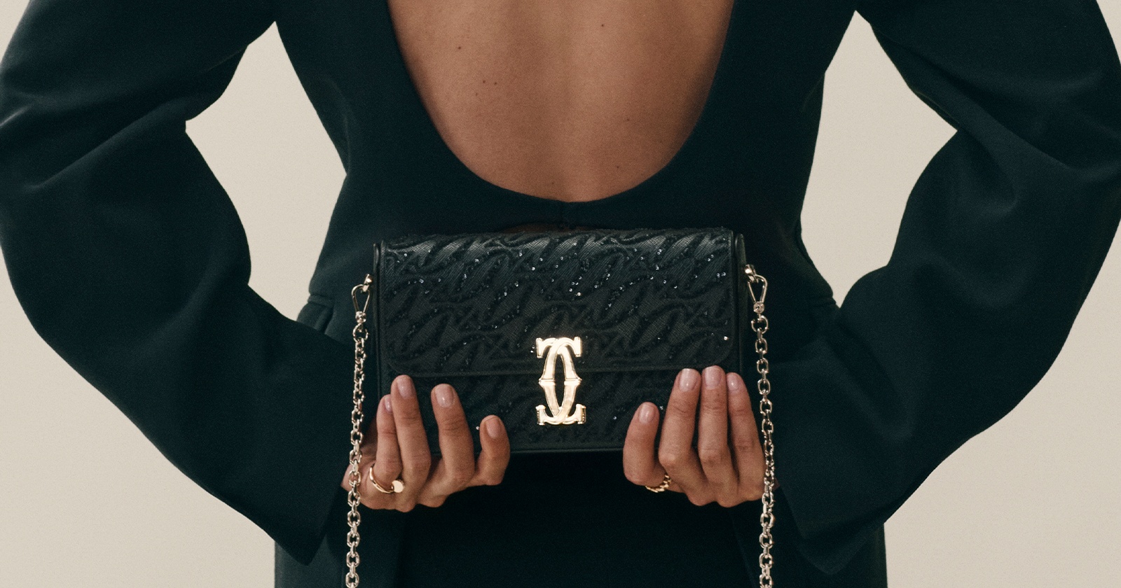 Image principale : Sac chaîne mini modèle C de Cartier, cuir de veau texturé et brodé de sequins, fermoir finition dorée, signature Cartier.© Denis Boulze © Cartier
