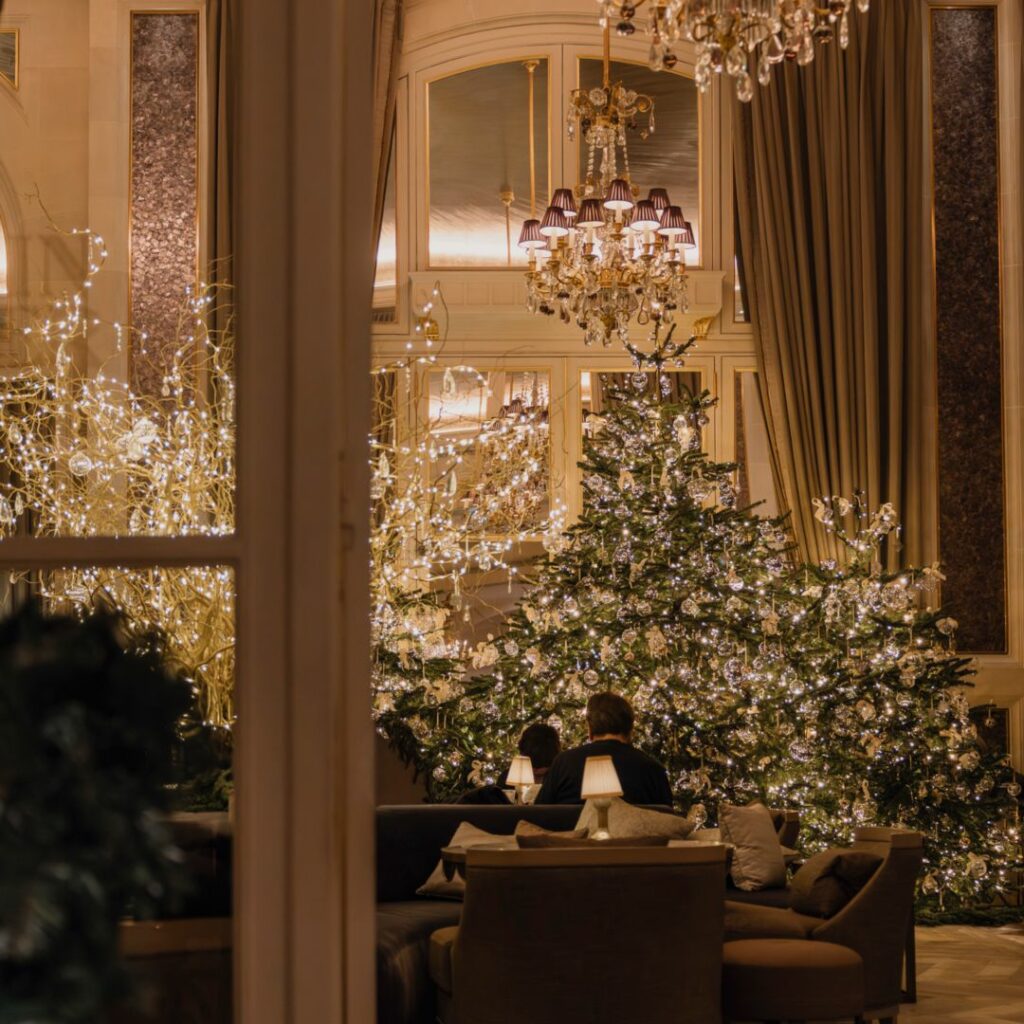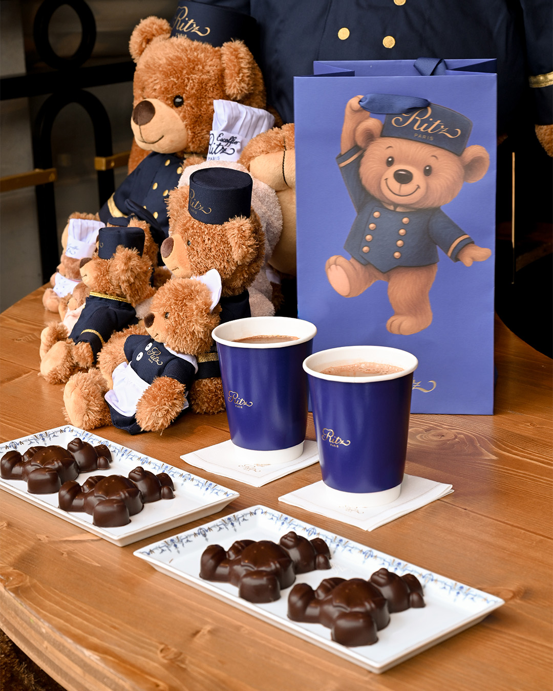 Difficile d’y échapper, l’ourson groom du Ritz Paris s’impose comme la mascotte officieuse des fêtes. Dans le lobby, un sapin de six mètres de haut décoré de 400 oursons donne le ton. Dans le péristyle, un ourson géant de 2,50 mètres. On craque pour un goûter à emporter, autour du chocolat chaud signature Ritz Paris (Venezuela 70 %, crémeux, épicé) accompagné d’une création exclusive : l’ourson guimauve et son caramel fondant. À deux pas, la boutique éphémère déploie toute la famille d’oursons : chef, voiturier, femme de chambre… rendant toute résistance vaine. Après tout, Noël n’est pas le moment de lutter.