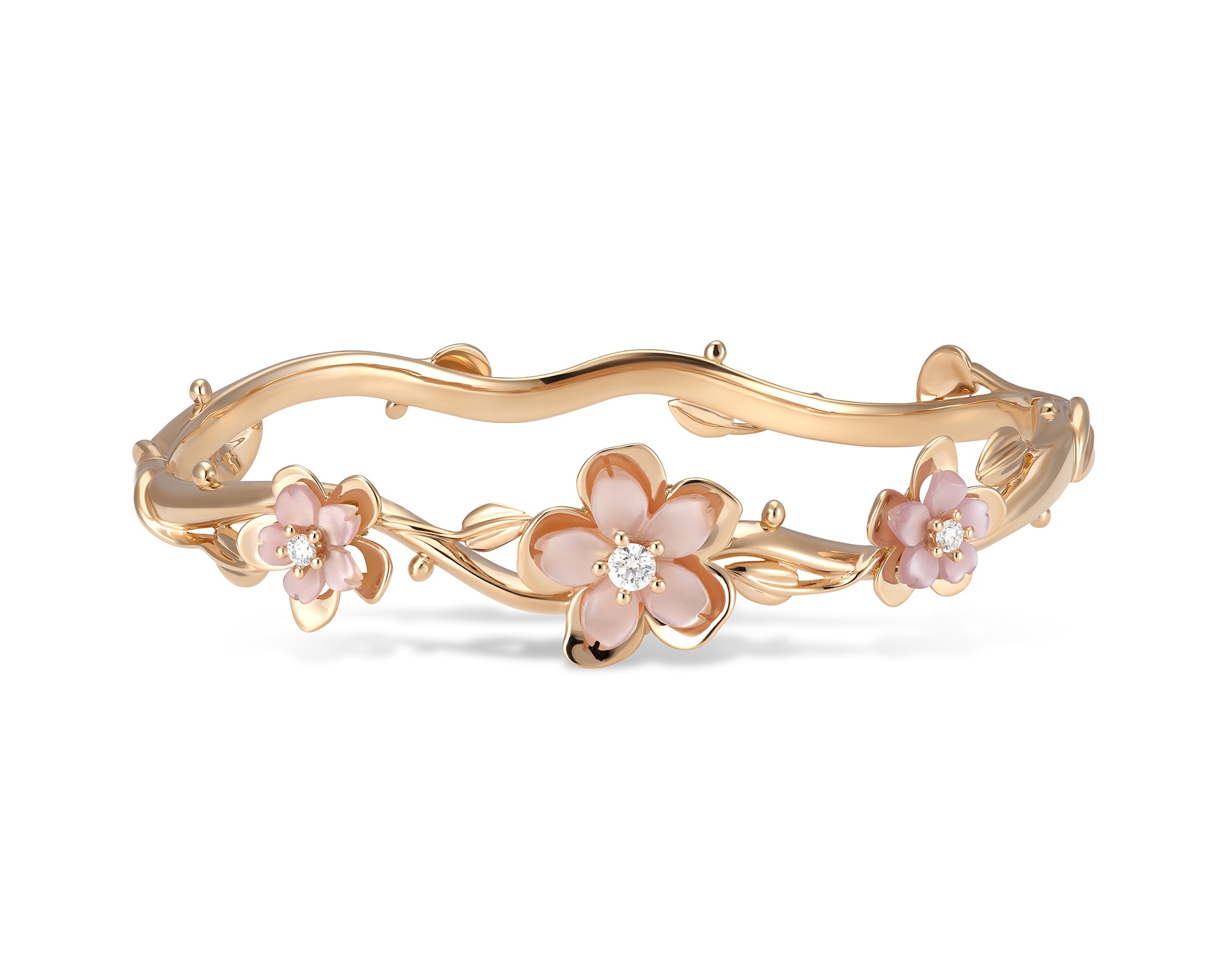 Faites ressentir le souffle de printemps japonais avec ces fleurs de nacre délicatement posées sur de l’or rose ou blanc.