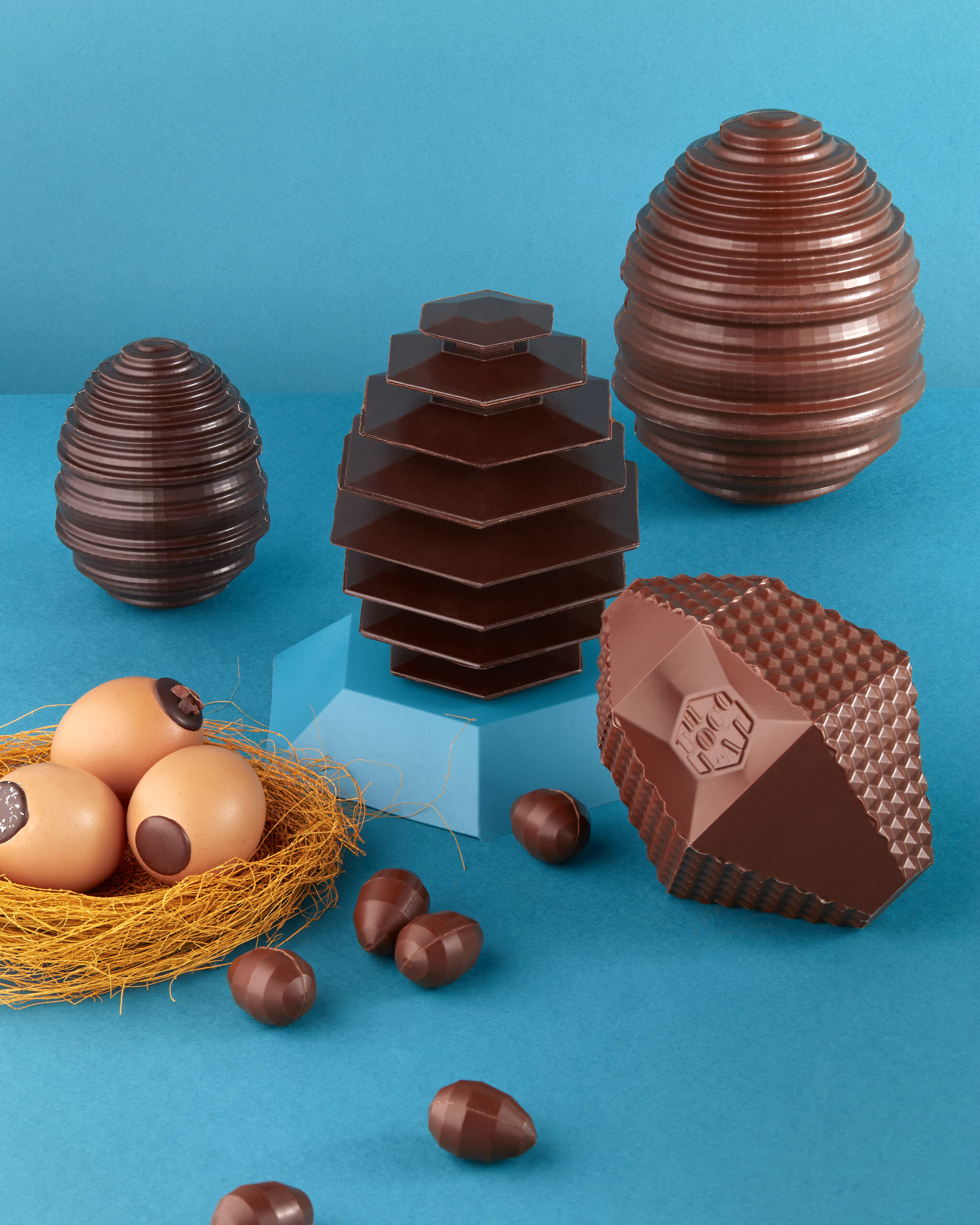 L’Œuf feuilleté est de retour avec un nouveau design, toujours aussi raffiné. Son nouveau concurrent : l’Œuf à monter et ses 8 disques à superposer. Sans oublier l’incontournable boîte d’œufs, élue coup de cœur des passionnés de praliné. Enfin, l’Œuf facetté, une autre création d’exception au praliné amande-noisette à la texture inimitable. Un côté lait et un côté noir, choisir ce n’est plus renoncer… La manufacture Ducasse a associé le savoir-faire de son designer Pierre Tachon à celui de son chef Quentin Francis-Gaigneux et de leur équipe respective pour réaliser ce travail d’orfèvre.