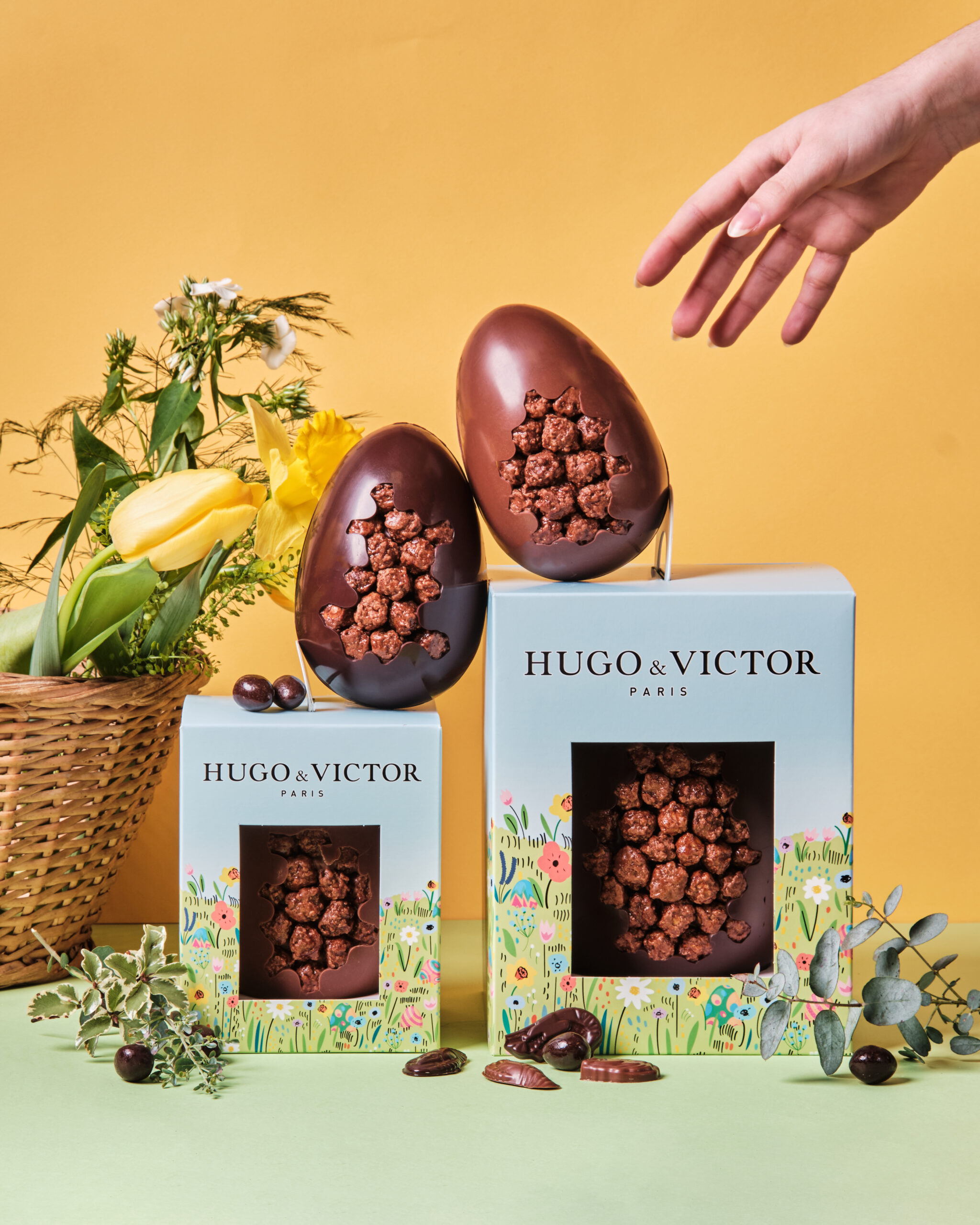 La création spéciale ultra gourmande du Chef Hugues Pouget : un œuf en chocolat au lait délicatement incrusté de noisettes caramélisées et généreusement garni de fritures ainsi que d’œufs praliné feuilleté au lait. Il est disponible en deux tailles : 240 g ou 500 g !