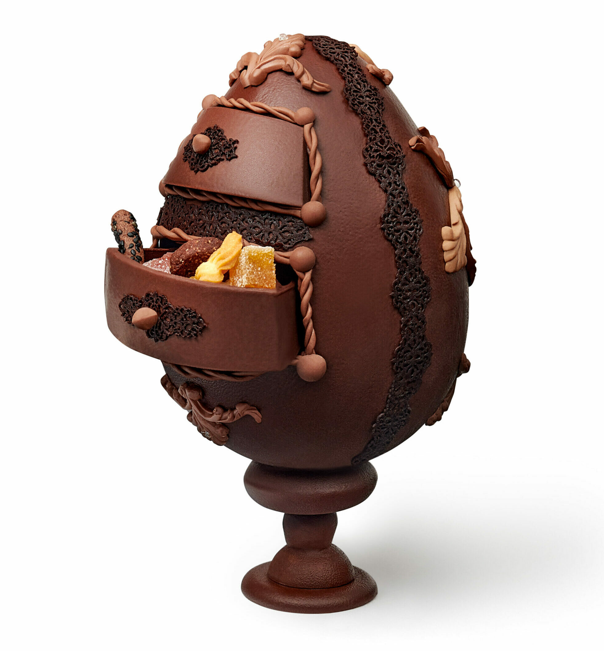 Élue pâtissière de l’année 2024 par Gault&Millau, Naraé Kim, cheffe pâtissière du palace, a imaginé une pièce alliant haute joaillerie et gourmandise, dont chaque tiroir dévoile des surprises, à la façon d’une boite à bijoux. L’œuf se présente comme une coque en chocolat noir, intégrant des tiroirs qui renferment une sélection de douceurs. L’arrière de l’œuf est composé de chocolat noir Guanaja, ainsi que du Gianduja noir et lait. Le socle est quant à lui généreusement garni d’un praliné noisette.