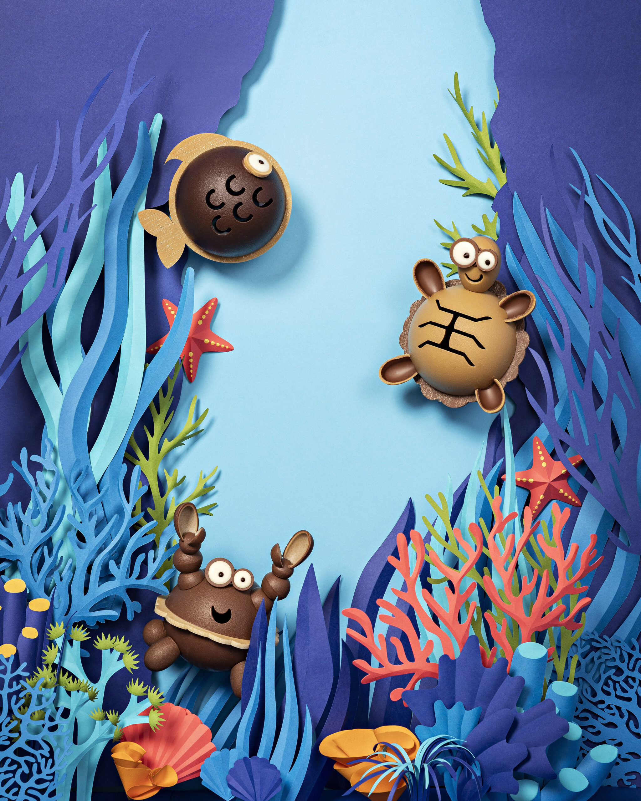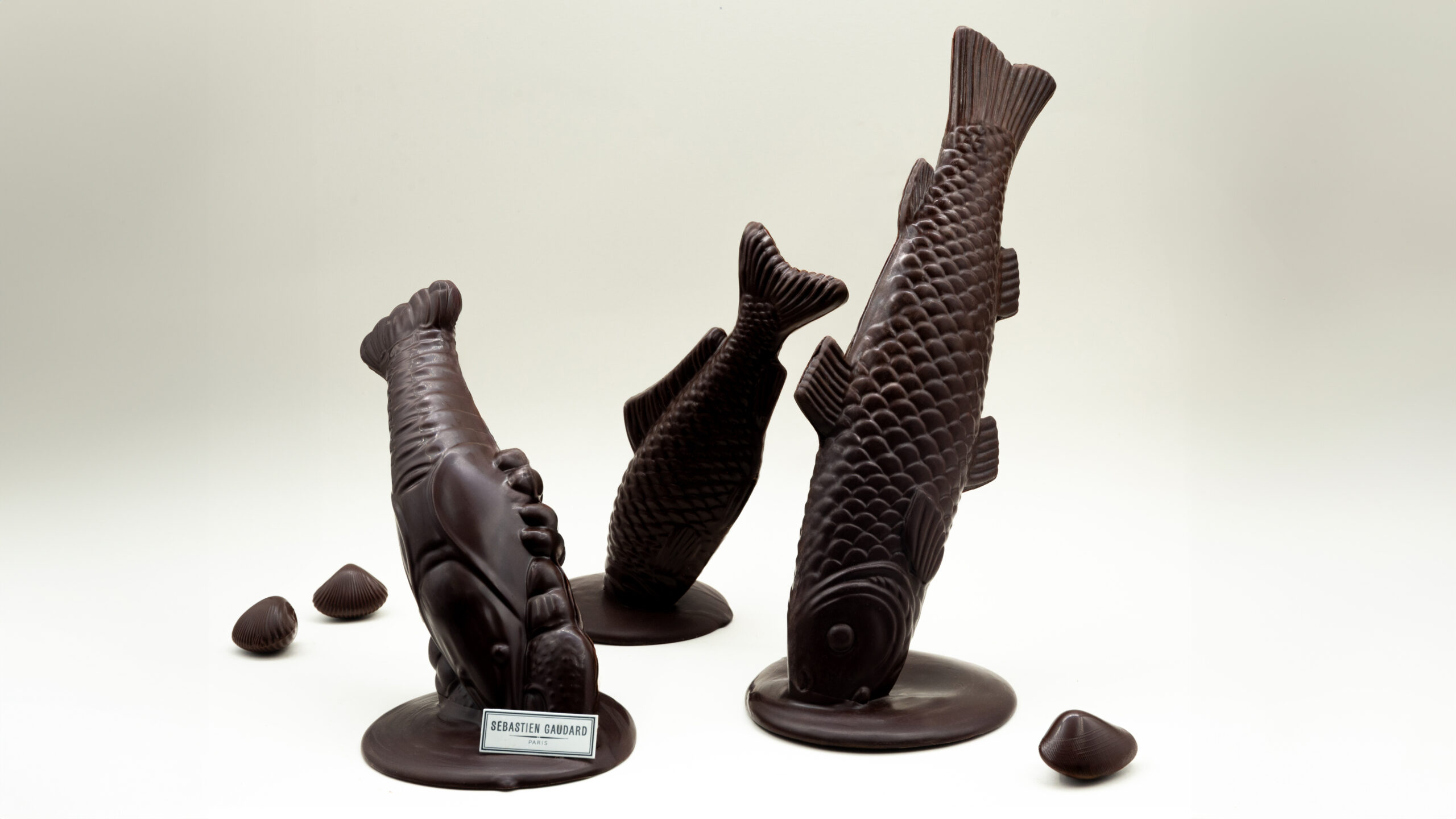 Le chef pâtissier Sébastien Gaudard dévoile une délicieuse sélection de friandises, dont de ludiques poissons en chocolat baptisés «Des ronds dans l’eau» qui plongent tête la première dans une mare chocolatée. Ces douceurs sont garnies de fritures et de coquillages au praliné. Un poisson d’avril très gourmand !