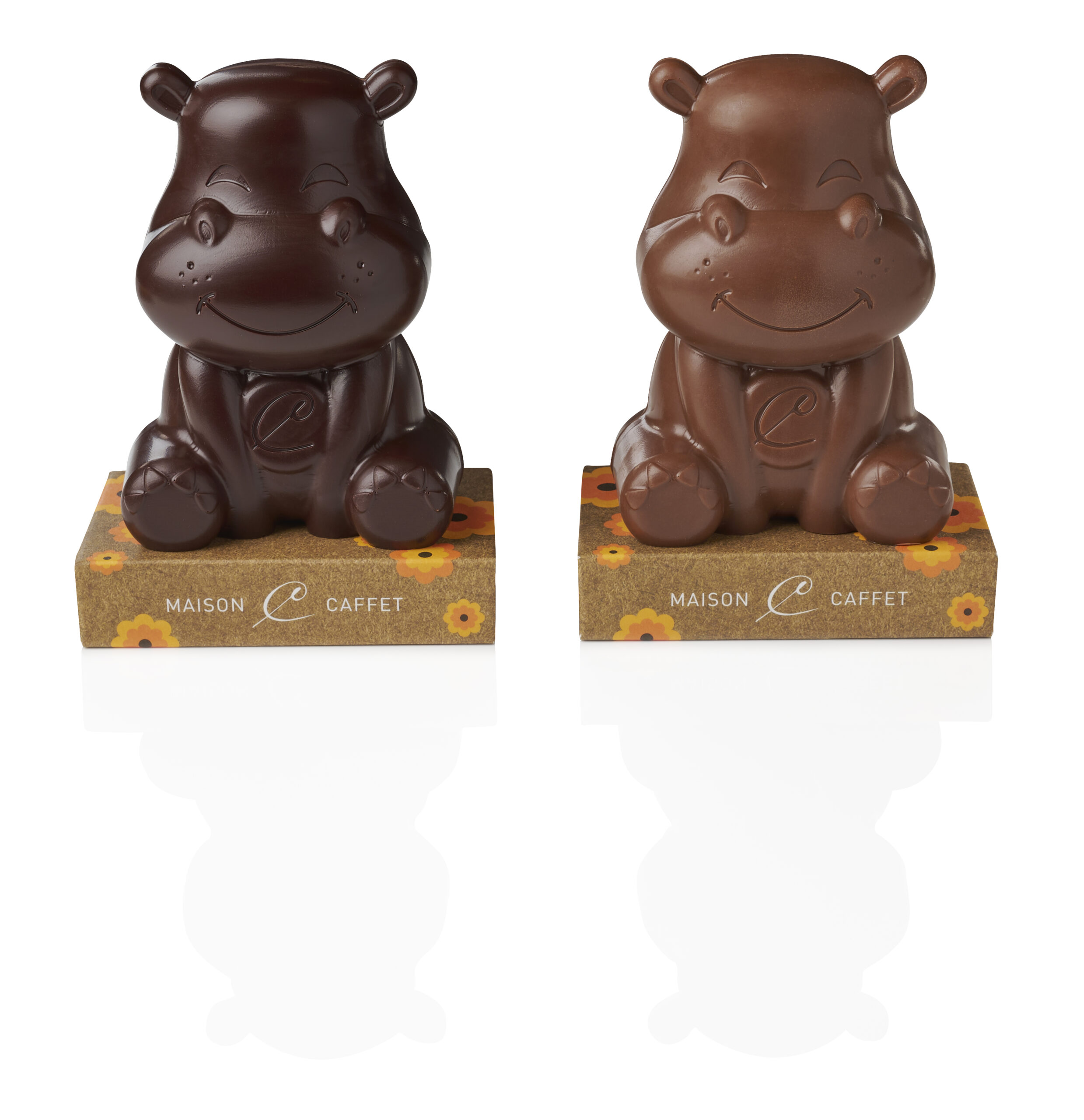 Le petit nouveau de cette année, Marco l’hippo fait son entrée dans le monde enchanté et gourmand des moulages de Pâques de la maison. Ici proposé en petite taille en chocolat noir intense 70% et en chocolat lait 36%.