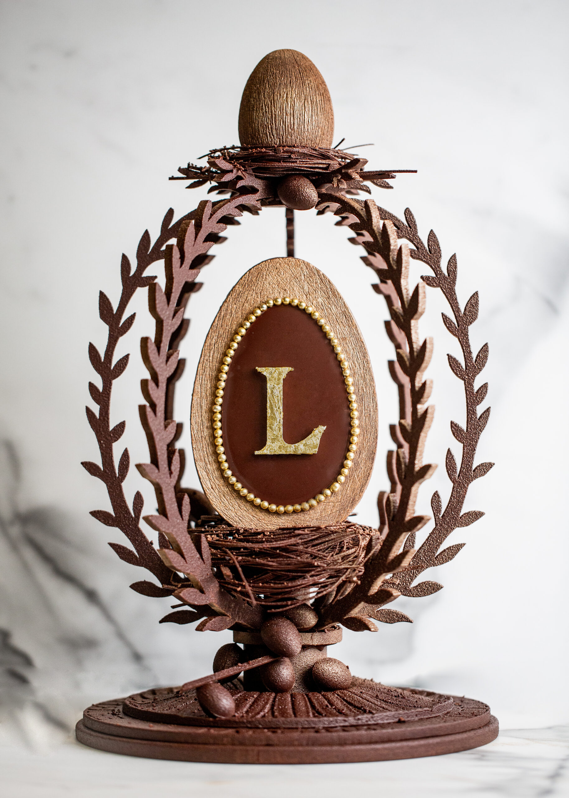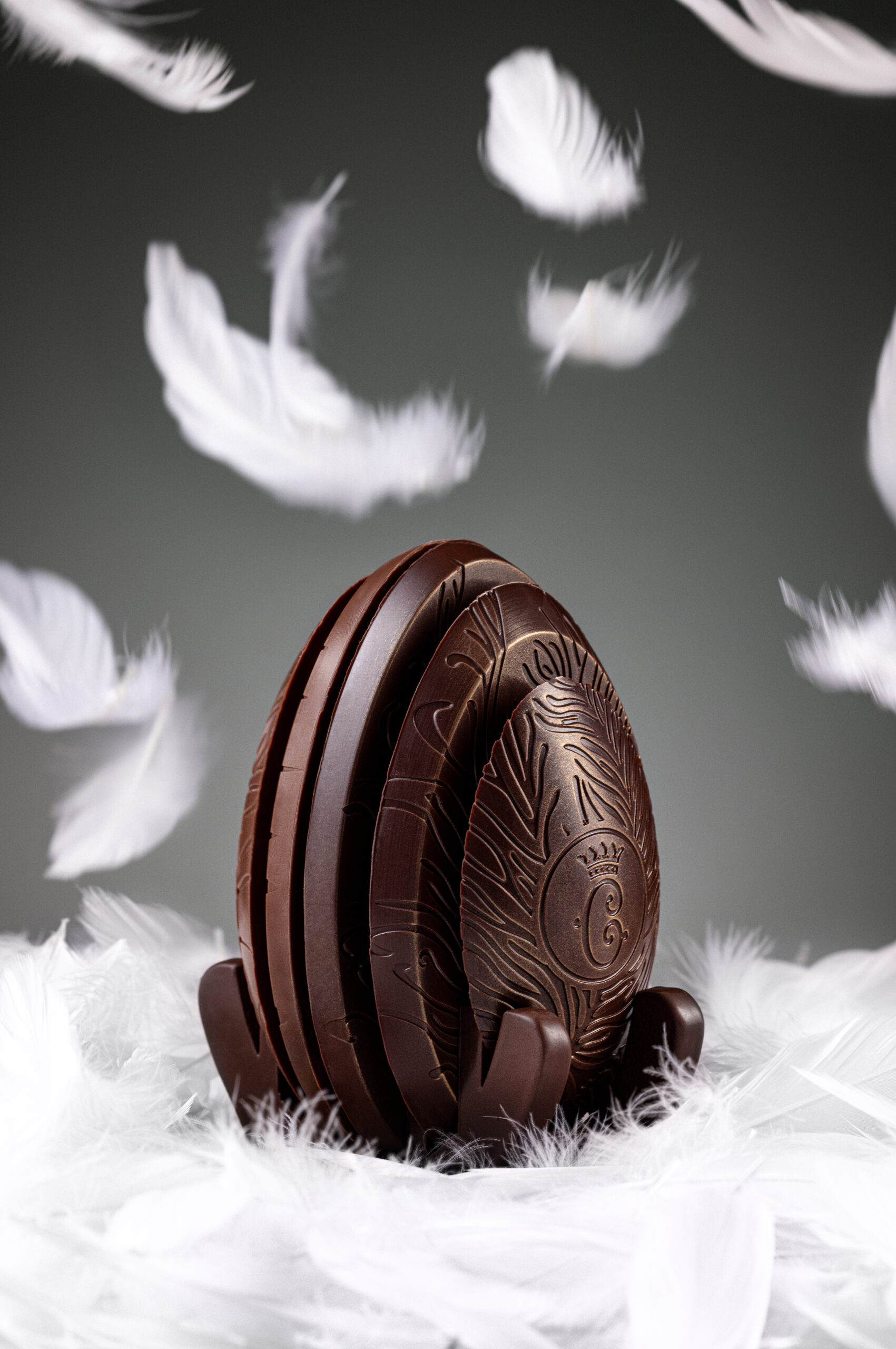 Cette année, le chef exécutif pâtissier Julien Alvarez imagine une pièce d’exception, en édition limitée, mettant en scène l’emblématique couronne de lauriers emblème de la Maison. La structure fine et délicate enveloppe un œuf gourmand, paré d’une aura scintillante. Pièce d’exception, cet œuf rend également hommage aux plafonds du salon de thé historique Ladurée rue Royale par les motifs de moulures parisiennes ornant sa base. Cette impressionnante sculpture en chocolat noir Macaé 62%, combine élégance et pure gourmandise.