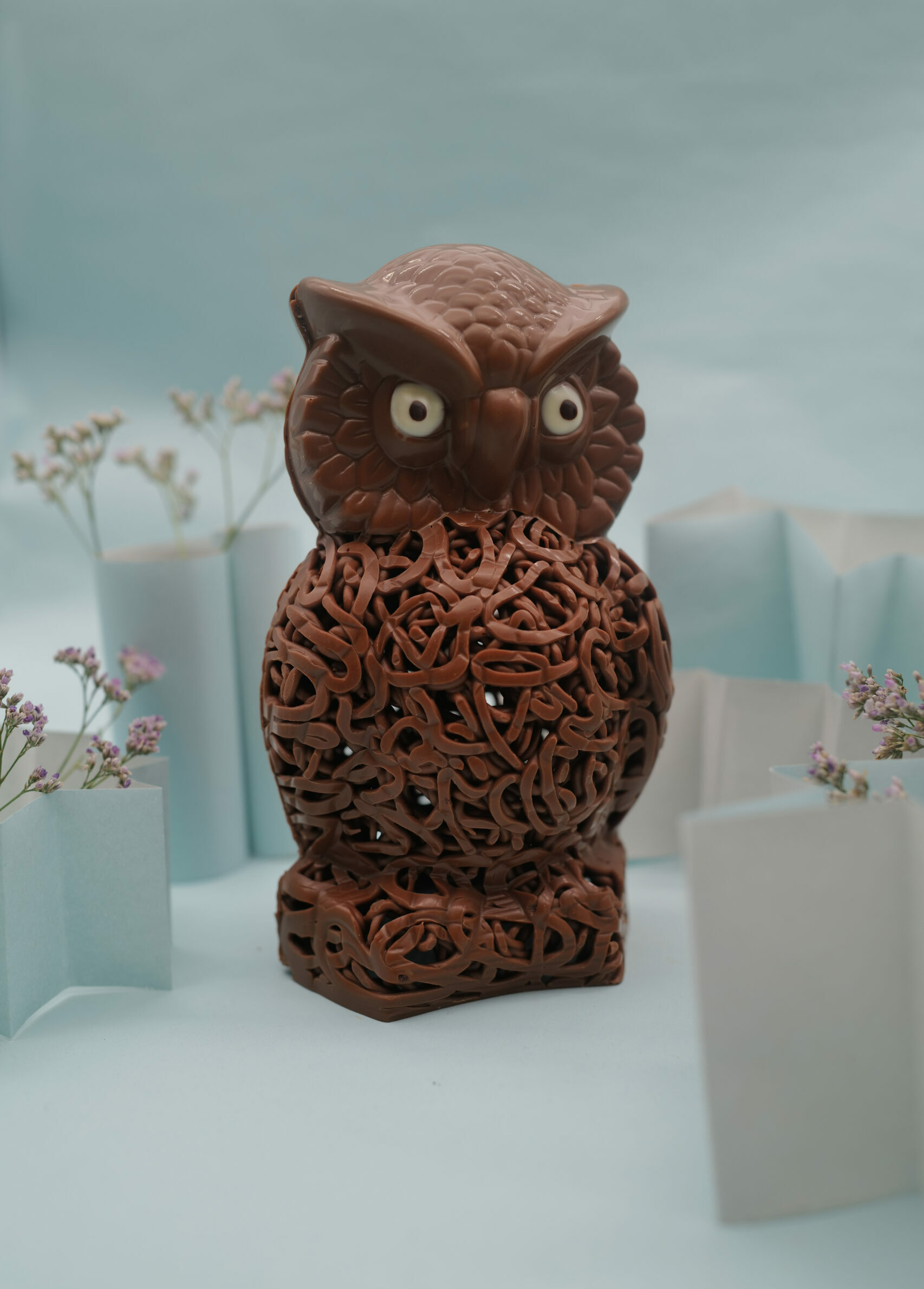 La chouette favoriserait l’intuition, connaissance et clairvoyance et son chant serait signe de beau temps, elle rejoint cette année la collection Dentelle Boissier aux côtés des lapins, tortues, poissons tropicaux et célèbres œufs. Elle est garnie de friture au chocolat noir et au chocolat au lait, sèche et fourrée praliné. Disponible au chocolat noir ou au chocolat au lait.