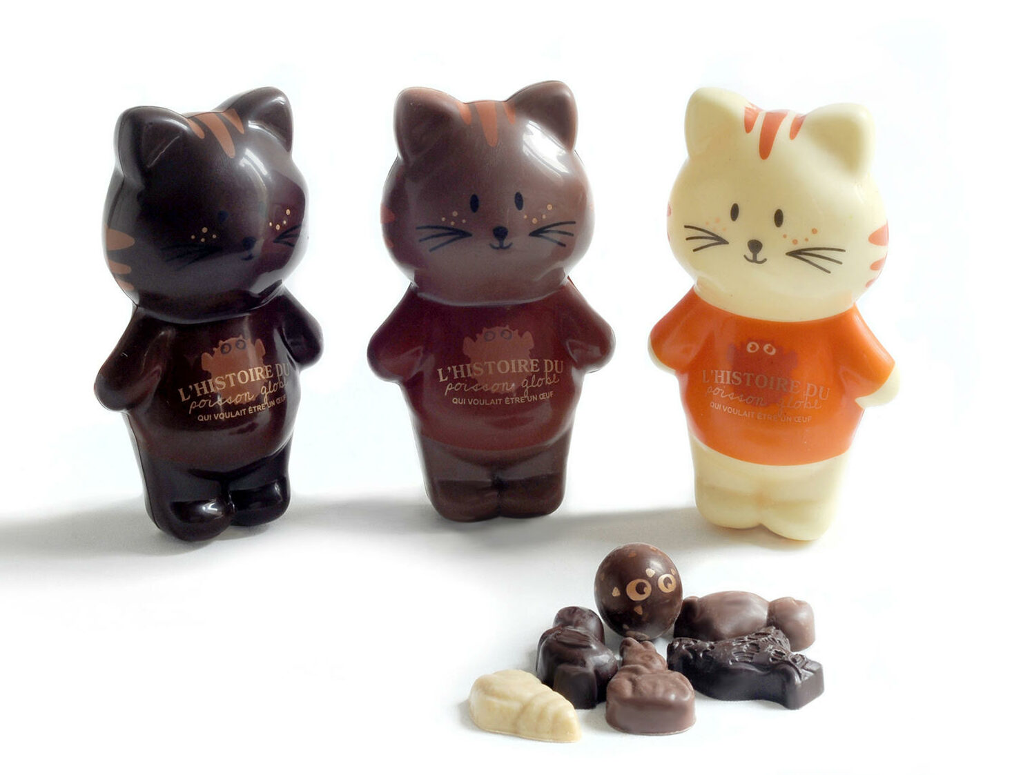 Pour Pâques, on fond pour les chatons de chez Chapon garni d’un assortiment d’œufs pralinés, au milieu desquels se cache un petit poisson globe, le moulage emblématique de la collection réalisé à partir du chocolat Equateur. Les petits félins sont déclinés en chocolat noir, au lait ou blanc.