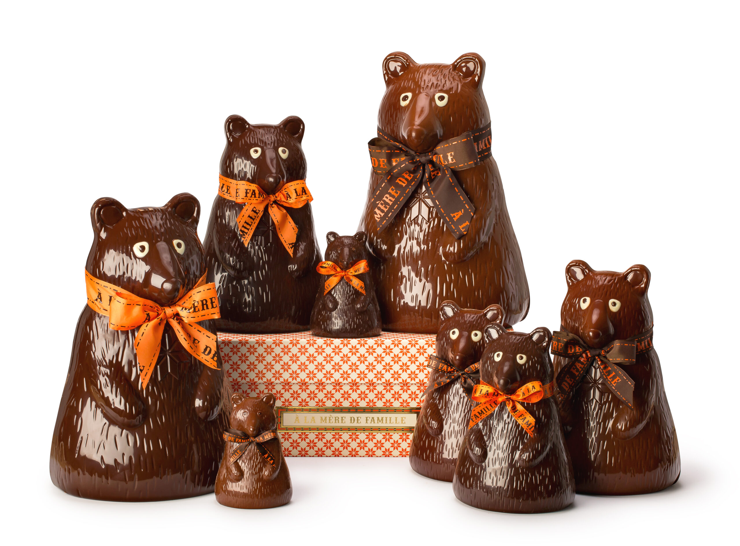 Plus on est de fous plus on rit ! Nouvelle recrue dans la grande collection de moulages de Pâques À la Mère de Famille, le gros ours en chocolat rejoint ses amis poissons, chiens, chats, lapins, tortue, poussin, poules, écureuils… Dessiné par la Maison, qui en a conçu le moule, et confectionné dans leur atelier à partir de la couverture de chocolat signature noir 65 %, il est délicieusement mignon et généreux, il renferme des fritures sèches et pralinées ainsi que de petits œufs papillotés au praliné.