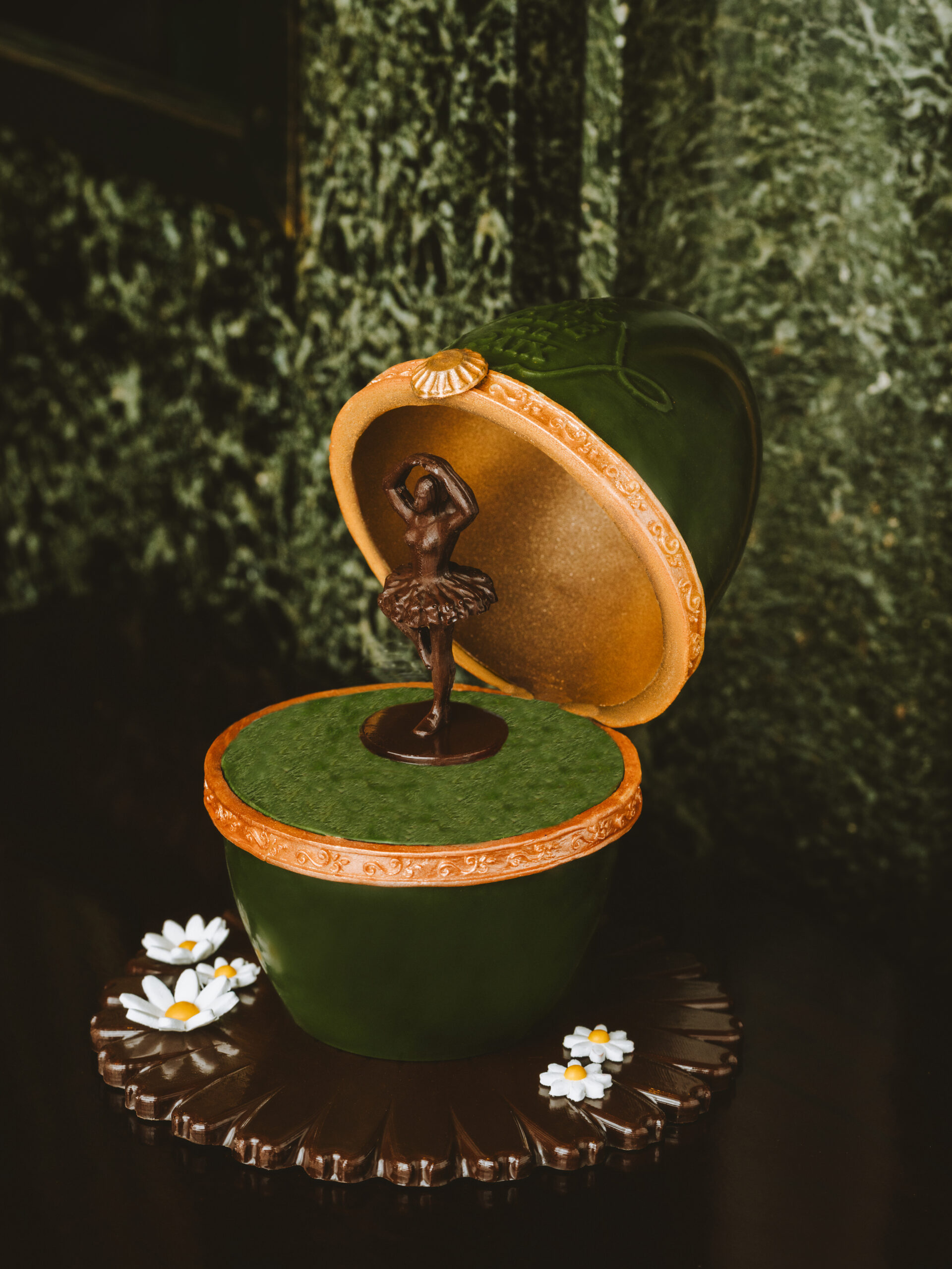 Le chef exécutif, Laurent André, a revisité l’œuf traditionnel en une élégante boîte à musique. L’œuf vert émeraude et délicatement souligné d’un liseré or éclatant, couleur emblématique de l’institution historique, renferme en son centre une ballerine habillée d’un tutu aérien. Élaboré à partir d’un chocolat noir Cluizel 65%, il renferme un double praliné onctueux amande et noisette, une feuillantine croustillante et un soupçon de chocolat au lait. Le « Fa de l’Opéra » est garni de fritures trois chocolats et de petits œufs de Pâques.