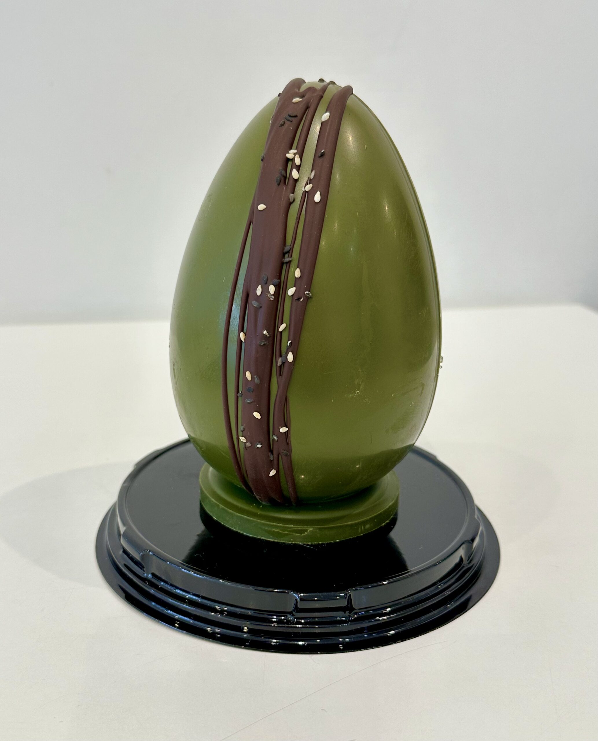 Les spécialités de Pâques dans cette délicieuse pâtisserie japonaise sont les originaux œufs au Matcha, ce thé vert japonais très à la mode, dont on raffole. Il se compose de chocolat blanc et de poudre matcha, addictif. À peine croqué, le chocolat révèle la fraîcheur du thé matcha. Il est garni de fritures au chocolat au lait, au chocolat noir et au matcha.