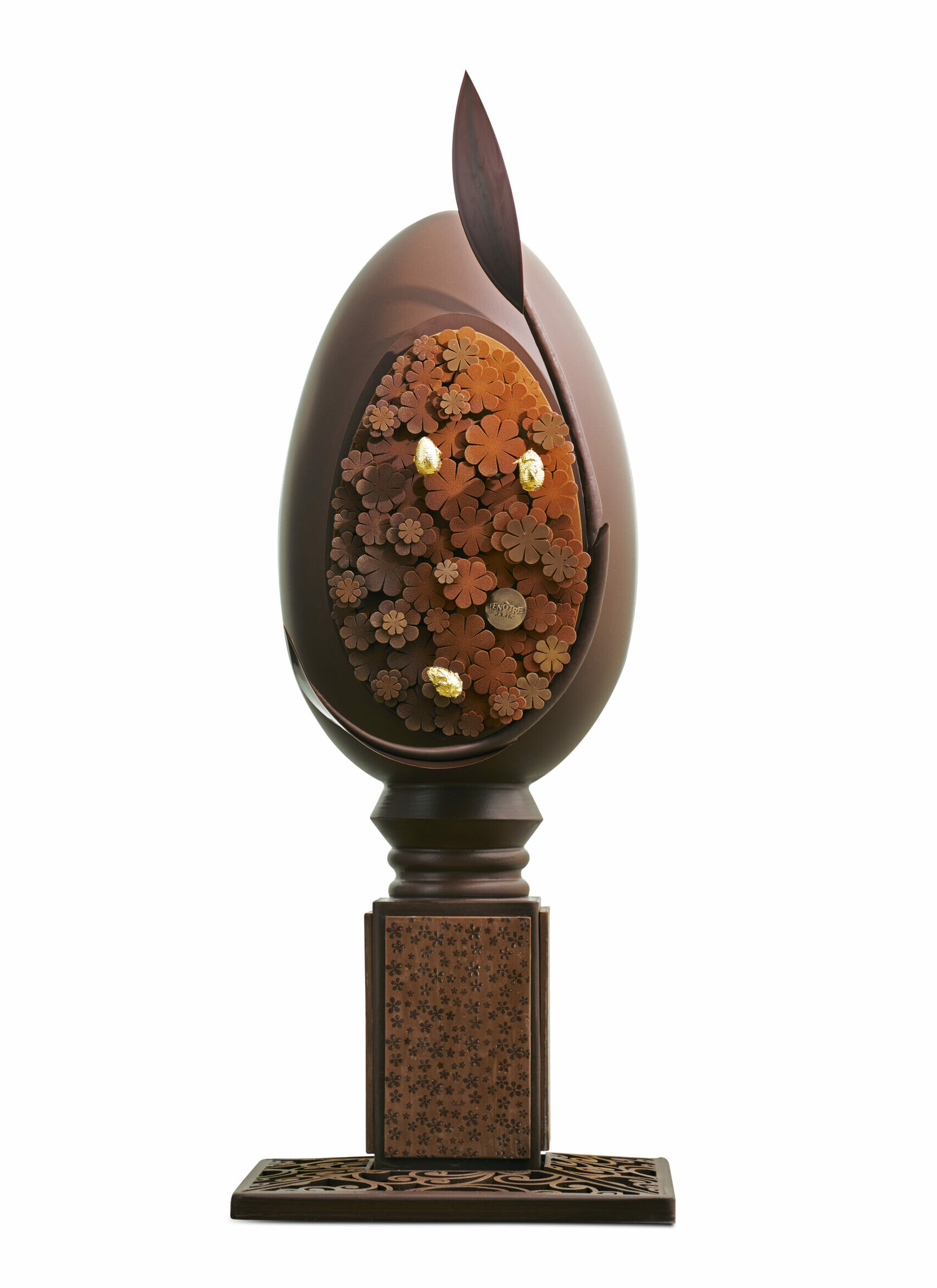 Le chef pâtissier Etienne Leroy imagine une spectaculaire œuvre d’art en chocolat sculpté. L’œuf Trésor de Pâques, une structure majestueuse de 11 kilos (!), est une mise en avant du savoir-faire des chocolatiers au sein des ateliers Lenôtre. Composé de plus d’une centaine de fleurs en chocolat, il marie l’intensité du cacao noir à la tendresse du chocolat au lait, accompagné d’œufs précieux drapés de feuilles d’or.