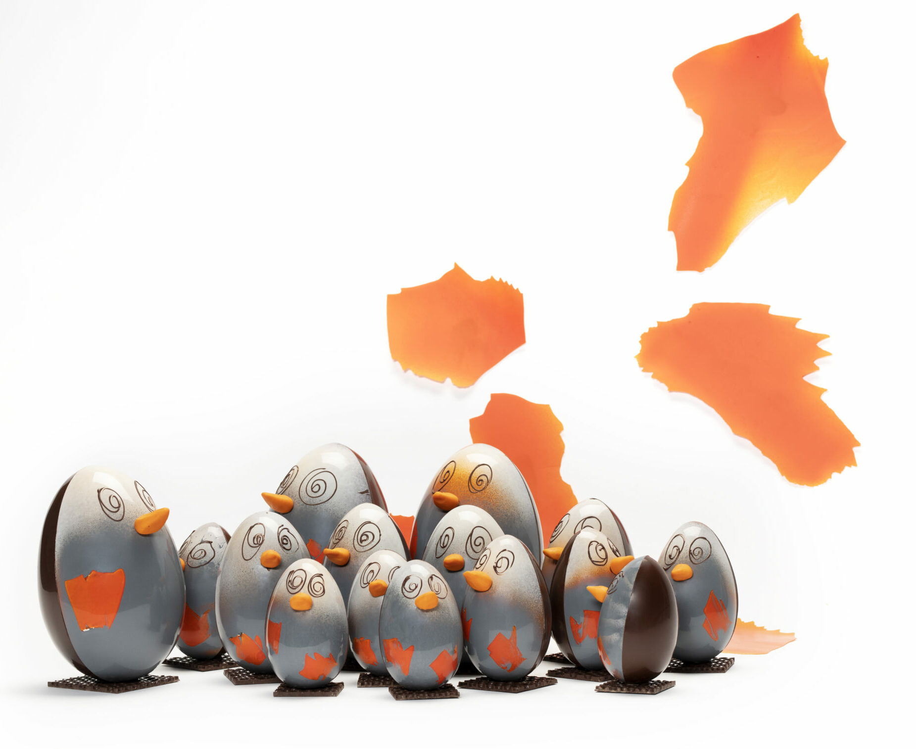 Dans la basse-cour, le chocolatier sculpteur choisit l’oie, représentée ici avec la simplicité et la joie d’un enfant : sur un œuf en chocolat noir et lait, il dessine de gros yeux tout ronds, plante un long bec orange et ajoute deux coups de pinceau pour représenter les pattes. Il la garnie de fritures noir, lait et blanc, fourrées au praliné noisette et gianduja.