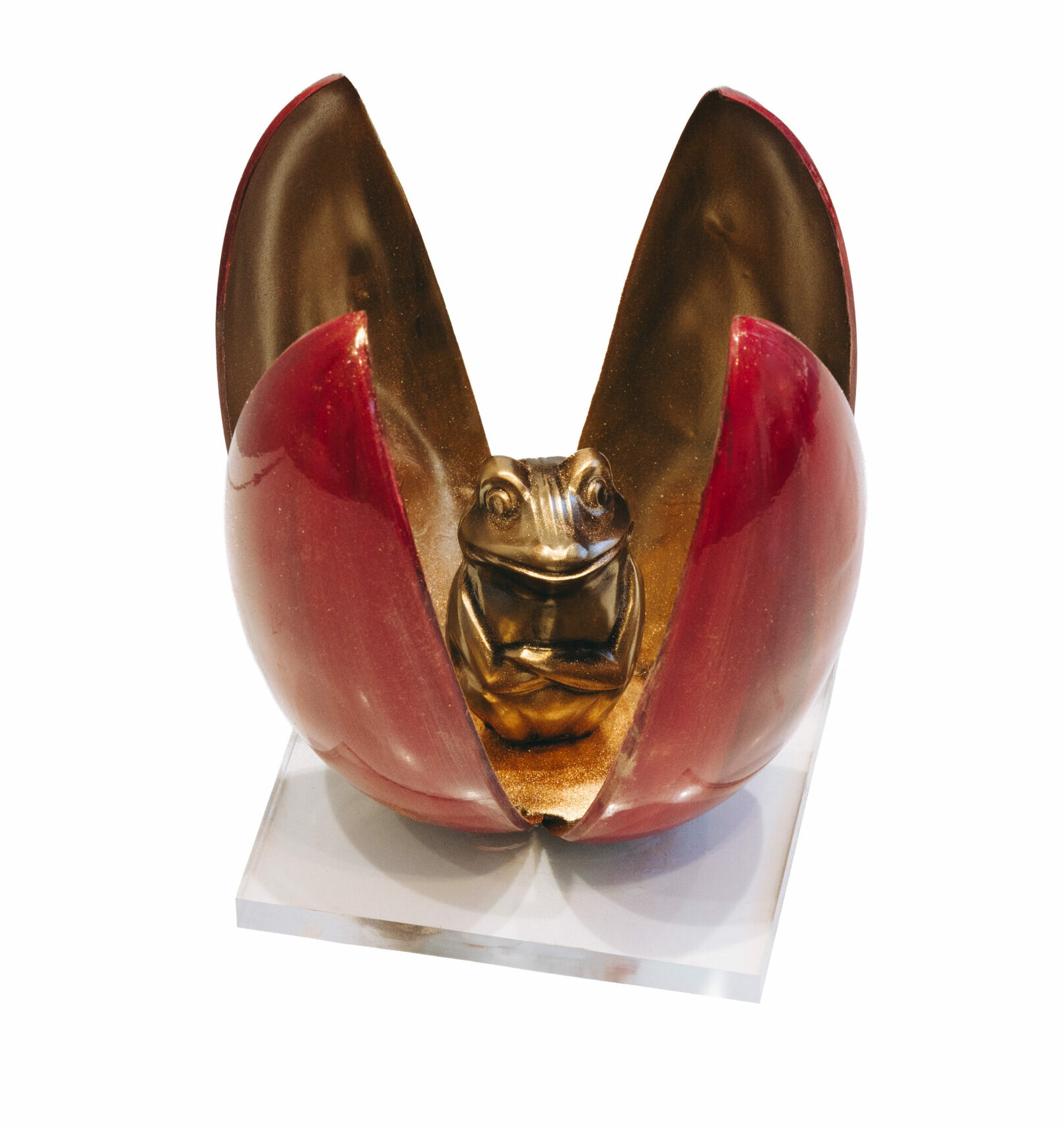 La chocolatière a imaginé des œufs-joyaux, qui rappellent les nénuphars, en collaboration avec Jean-Baptiste de Connick, designer mode. Chaque œuf est découpé en quartiers semblables à des pétales, abritant un trésor praliné. Un superbe visuel pour l’œuf grenouille qui évoque les contes de Grimm.