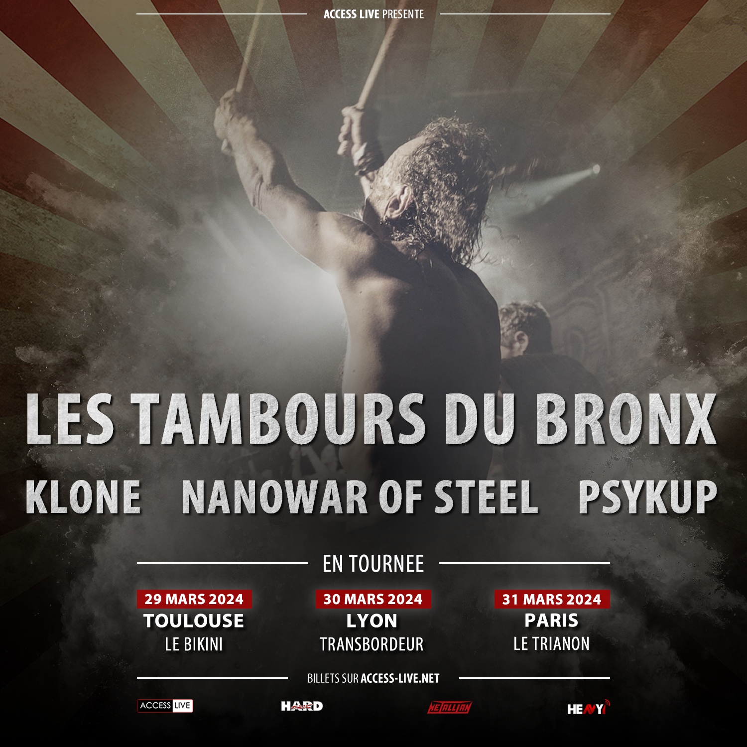 Access Live réunit pour la première fois quatre groupes aux horizons totalement différents mais complémentaires. Les Tambours du Bronx viendront faire résonner leur percussions précédés des mélodies immersives de Klone, le metal à la fois parodique et prenant des italiens de Nanowar of Steel, ou encore l’autruche core de Psykup. Quatre tendances, quatre saveurs métalliques pour une soirée remplie de surprises !