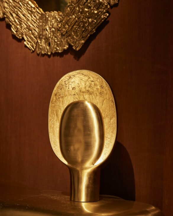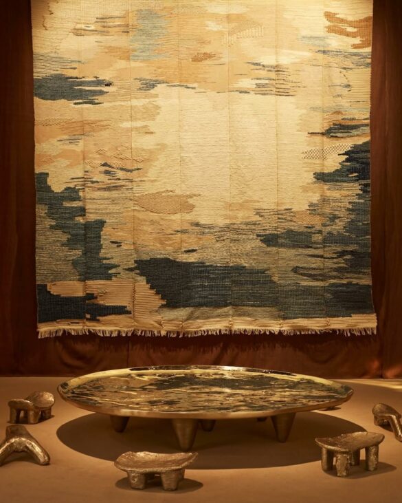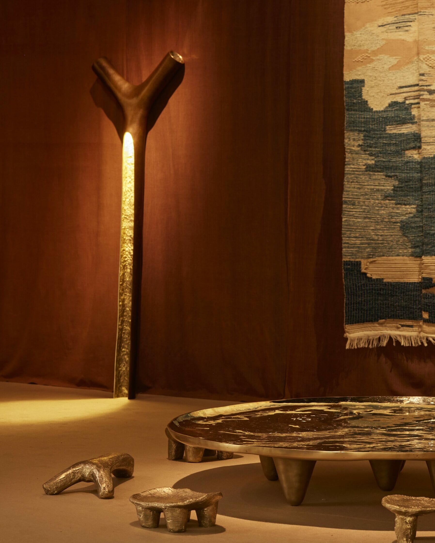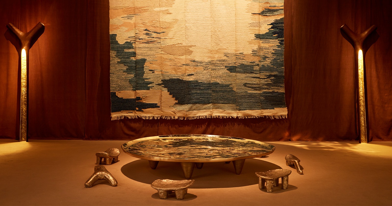 Cette année, le PAD a également décerné le Prix Spécial du Jury, remporté par Maison Intègre. Installée depuis 2017 à Ouagadougou, capitale du Burkina Faso, l’atelier créatif fabrique des meubles et objets en bronze selon un savoir-faire ancestral à la cire perdue. Avec plus d’une quinzaine d’artisans, Maison Intègre réalise des pièces à partir de matériaux naturels et métaux recyclés, dans le but de soutenir et de faire vivre ces métiers d’art. Riche en collaborations, des designers et artistes sont souvent invités en résidence à Ouagadougou pour développer des projets avec les artisans de l’atelier. Pour le PAD Paris 2026, Maison Intègre place au centre de son stand une table en bronze capturant l’empreinte aléatoire des graines de flamboyant, avec en arrière plan, une tapisserie évoquant un coucher de soleil.