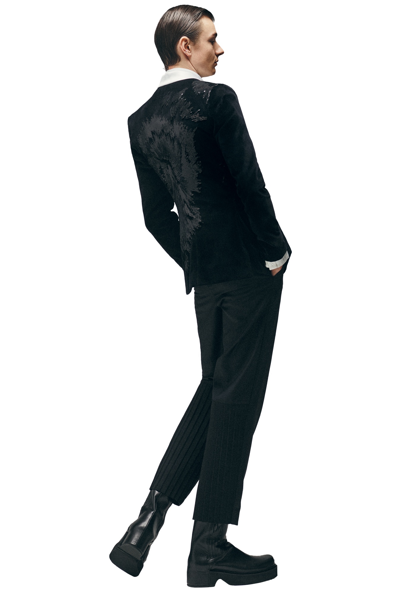 Passaro est-il un créateur woke ? «Oui, il y a de cela pour ce qui concerne la connaissance de soi, pour me comprendre. Londres m’a permis de me transformer, c’est là-bas que j’ai commencé à me comprendre et à entreprendre un travail de déconstruction-reconstruction de moi-même. J’ai travaillé sur l’idée du soi en tant qu’ensemble de plis. Nous avons plein de facettes, plein de personnalités différentes qui forment un ensemble. Cela change constamment, et donc les plis ne sont jamais figés, toujours en train de s’ouvrir ou de se refermer. D’où la présence de beaucoup de plissés, de soufflets dans ma collection.» Sa collab avec le londonien Khanh Brice Nguyen, disponible fin octobre, tourne également autour de l’idée de guérison. «L’idée est d’aller en soi et d’aller mieux en mélangeant nos savoir-faire : le tailleur pour moi, la maille pour Khanh Brice Nguyen. Qu’est-ce que guérir ? Un processus qui ne finit jamais. D’où l’idée de points de suture et de vêtements évoquant les bandages, les plâtres… Mais, bien sûr, l’essentiel demeure pour moi qu’un vêtement soit d’abord portable, bien construit et de qualité.»