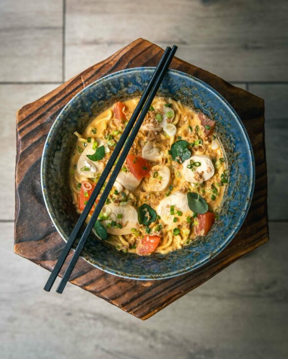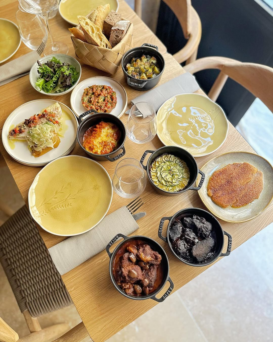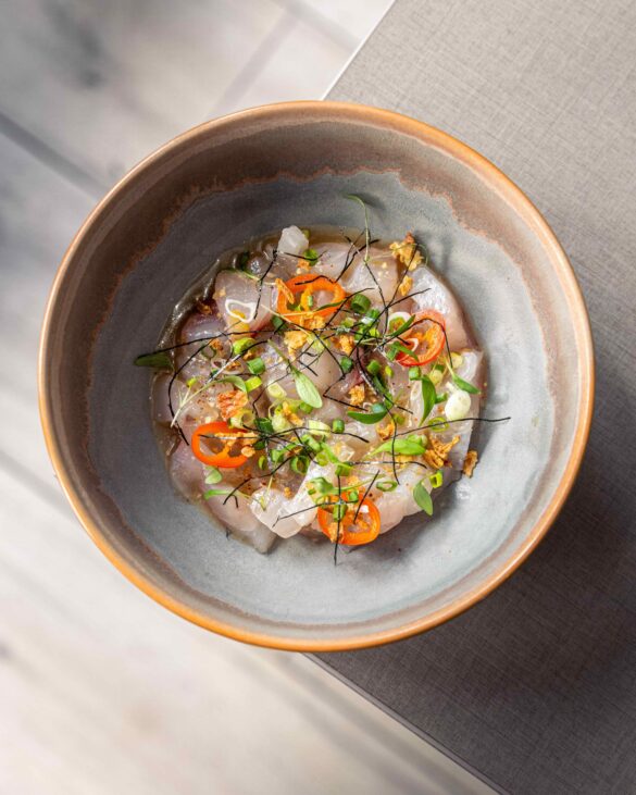 Le chef Pierre Lambert propose midi et soir une carte inspirée où chaque plat, du tartare de bœuf au miso épicé, aux udon maison au bouillon dashi ou aux nouilles, est préparé sur place. On recommande de choisir deux à trois assiettes par personne, qui arrivent au fil de l’eau, choix parfait pour découvrir la diversité des saveurs : sashimi de bonite, crêpe façon okonomiyaki aux crevettes ou encore os à moelle gratiné au miso épicé. L’expérience ne saurait être complète sans une touche sucrée : la barbe à papa, twistée au yaourt et olives noires, fait sensation et apporte une note ludique et inattendue au repas. Les desserts maison, comme le crémeux citron et nuage de verveine ou la profiterole de l’Audass’ (parfum à deviner), témoignent de la même créativité.